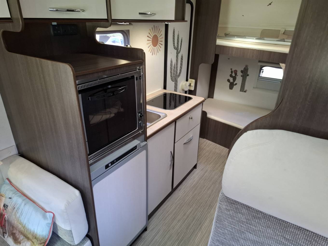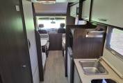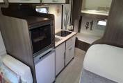 Behind the single dinette is the central kitchen, with a hob with 2 gas burners, a combination oven/grill, a microwave, a fridge with a freezer box, and a sink,