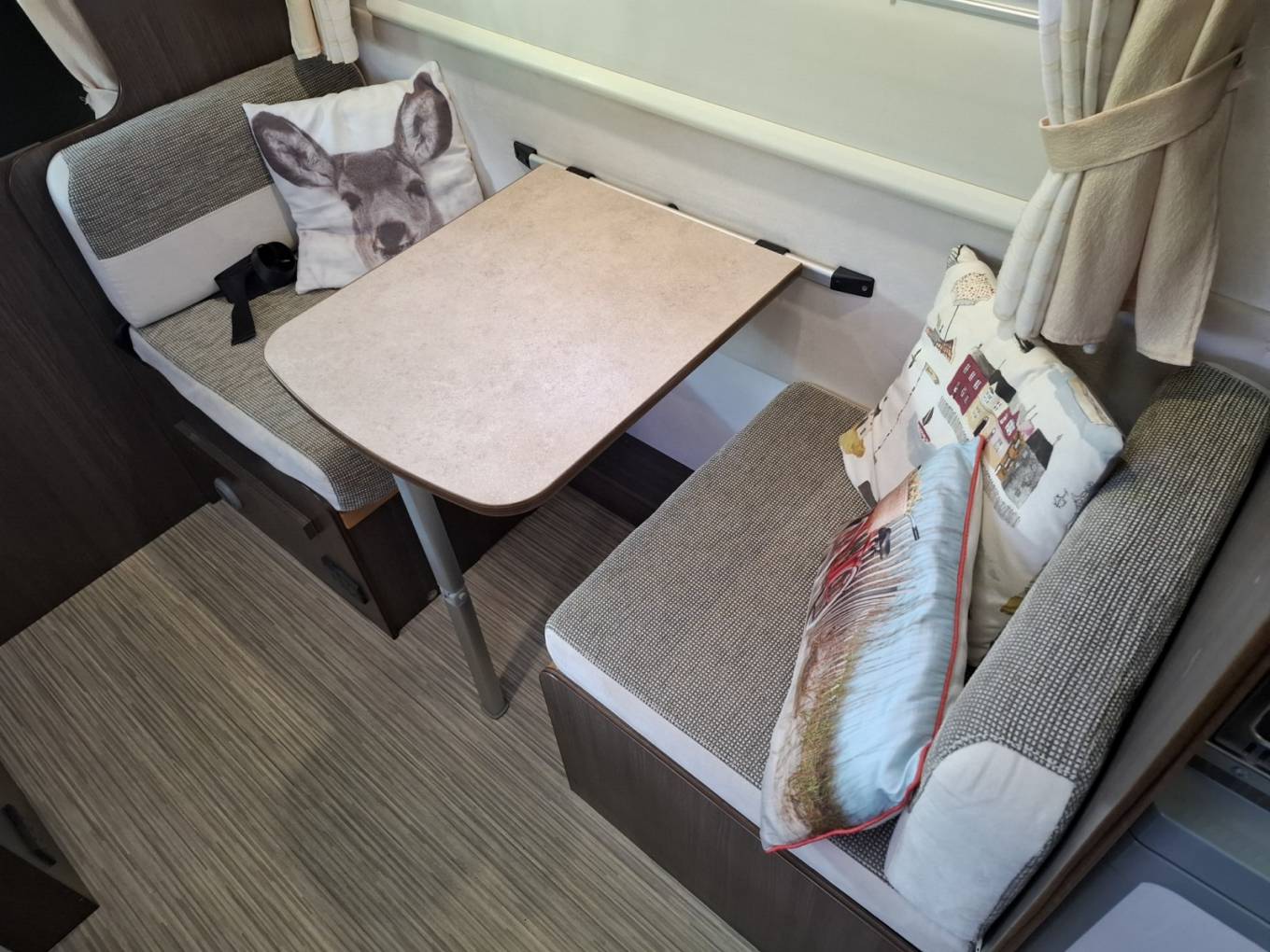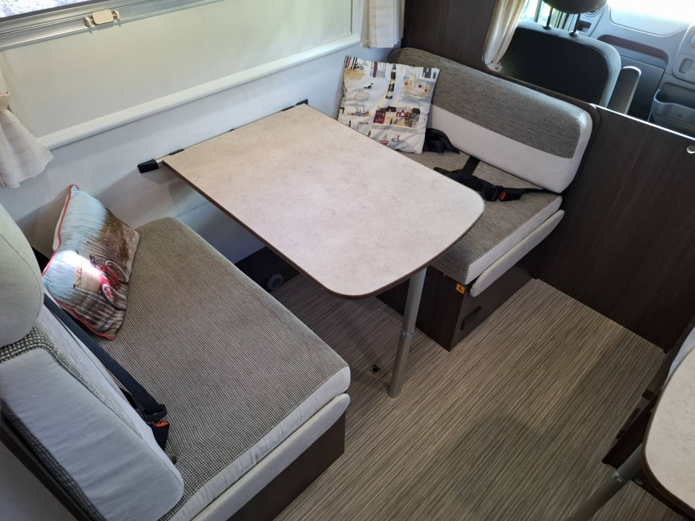 Behind the cab, at the front of the habitation, is a nearside double dinette (with 2 x forward facing 3-point seat belts and 2 x rear facing lap belts) that converts to a full double berth.On the offrside there is a single dinette (with a rear facing lap belt) that can be used as a shorter single berth.