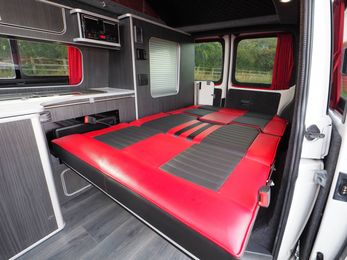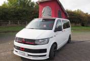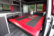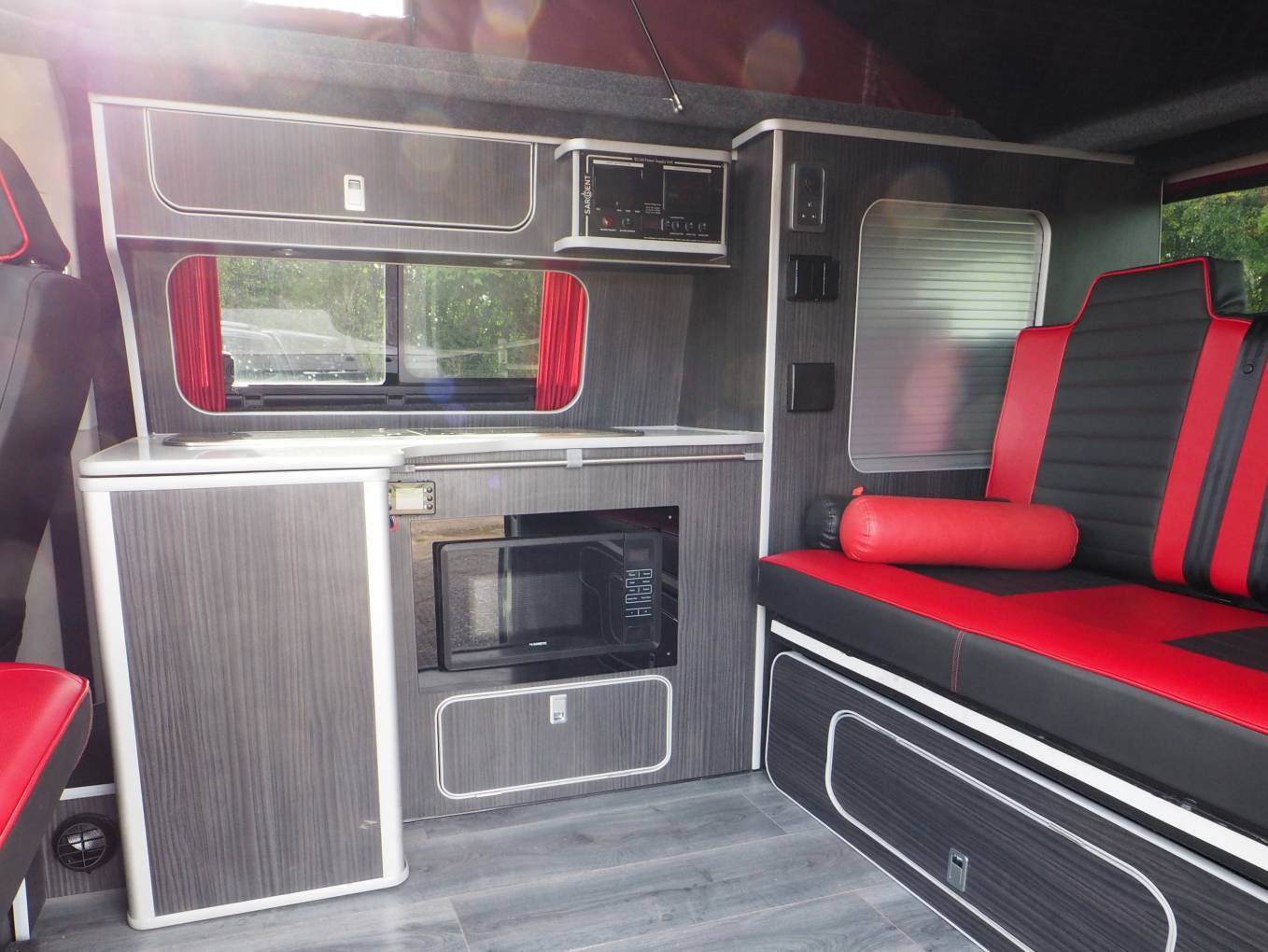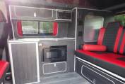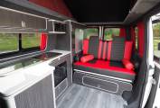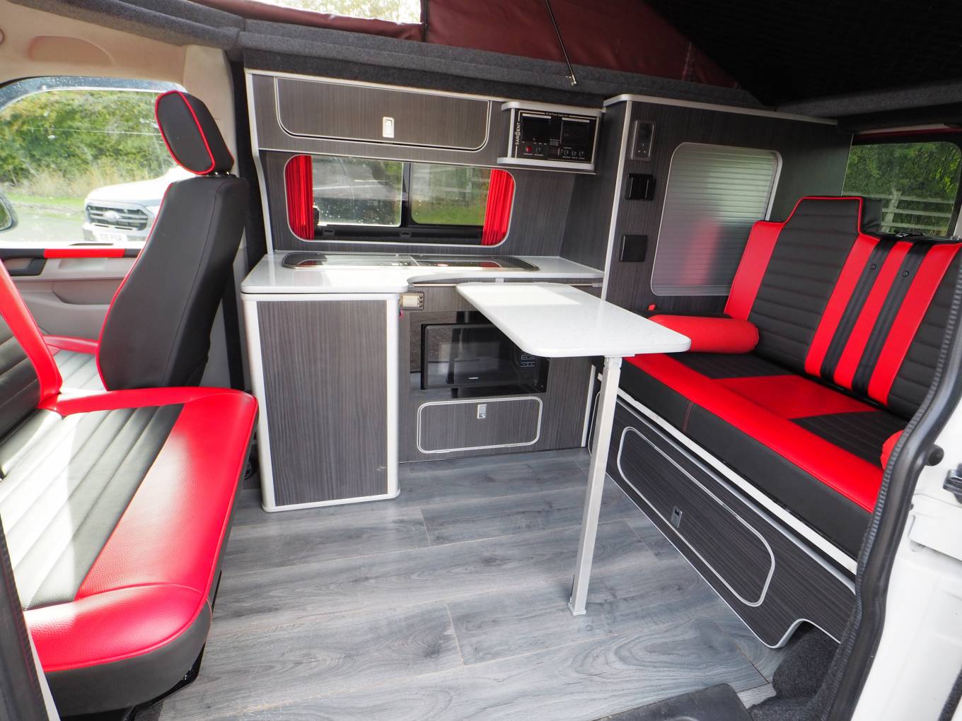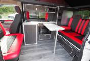A comprehensive conversion includes the Poptop and bed board providing the 3rd and 4th berths to compliment the electric rock n roll bed which provides the additional sleeping space. Finished in a striking red and black leather with red highlights such as the red poptop canvas, red LED lighting and red detailing to the front grill, the T5.1 sits on attractive black alloys with a sparkle finish. A leisure battery provides 12v electrics and there is 230v electric hook-up. A gas bottle is fitted to power the 2 burner gas hob and heating is via a diesel heater with separate control panel. Alongside the hob is a sink with tap, a microwave oven and a fridge with freezer box. The front passenger seats swivel into the main habitation area and along with the pop-up table creates a relaxing place to dine and entertain. There is a padded footstool with built in porta-potti.