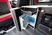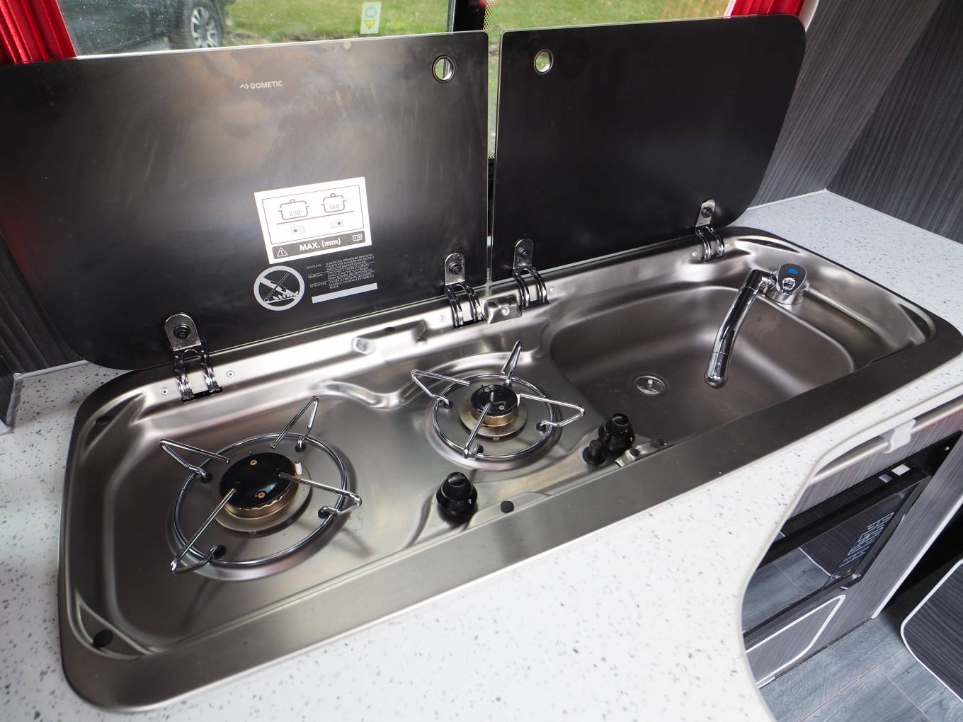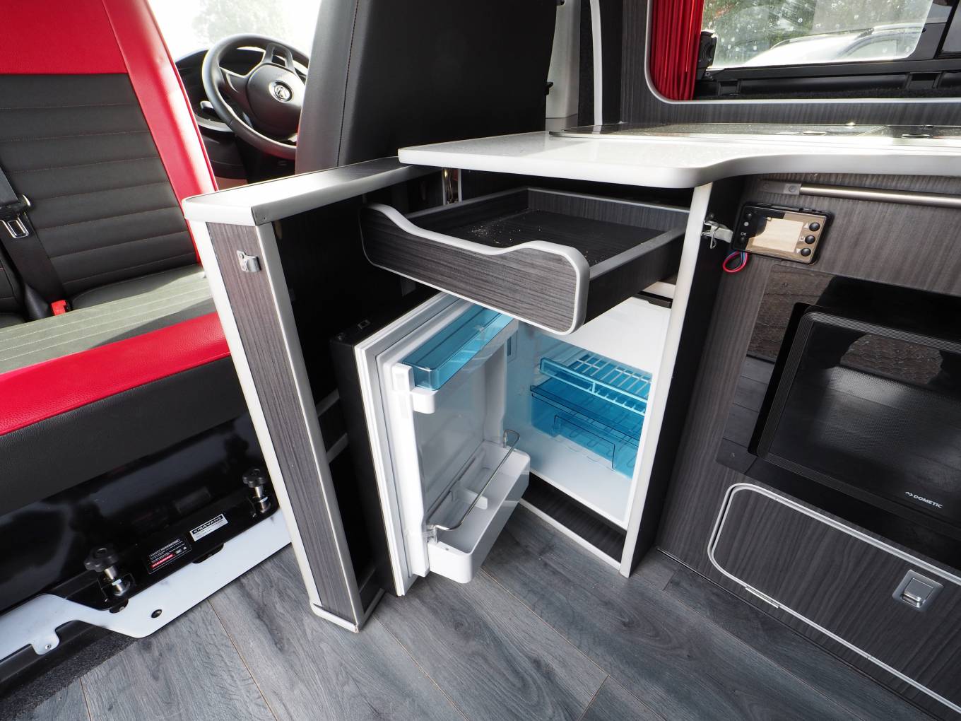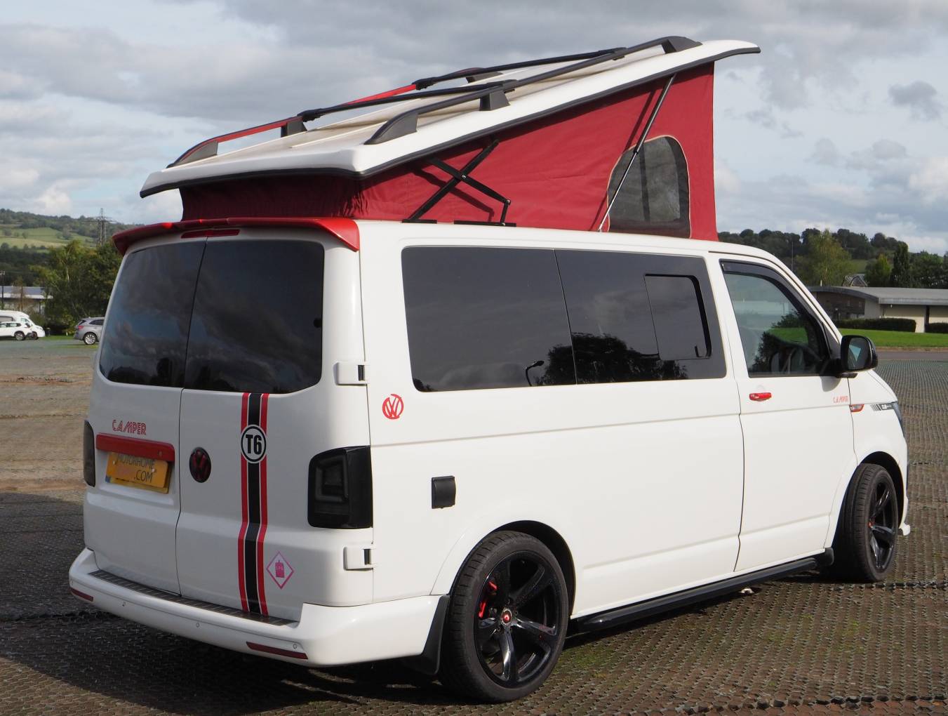 A comprehensive conversion includes the Poptop and bed board providing the 3rd and 4th berths to compliment the electric rock n roll bed which provides the additional sleeping space. Finished in a striking red and black leather with red highlights such as the red poptop canvas, red LED lighting and red detailing to the front grill, the T5.1 sits on attractive black alloys with a sparkle finish. A leisure battery provides 12v electrics and there is 230v electric hook-up. A gas bottle is fitted to power the 2 burner gas hob and heating is via a diesel heater with separate control panel. Alongside the hob is a sink with tap, a microwave oven and a fridge with freezer box. The front passenger seats swivel into the main habitation area and along with the pop-up table creates a relaxing place to dine and entertain. There is a padded footstool with built in porta-potti.