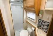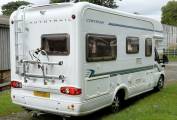 Externally there is a two bike carrier and tow bar and access to the under sofa and under bed storage. A roof mounted solar panel services the leisure battery that provides 12v electrics. There is 230v electric hook-up and two gas bottles. Heating and hot water from the Truma duel fuel boiler.