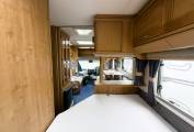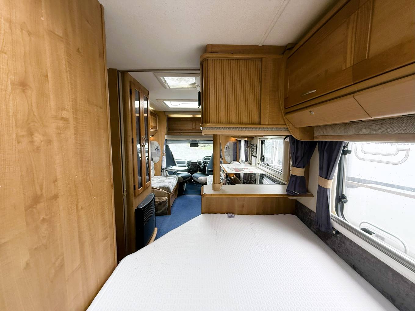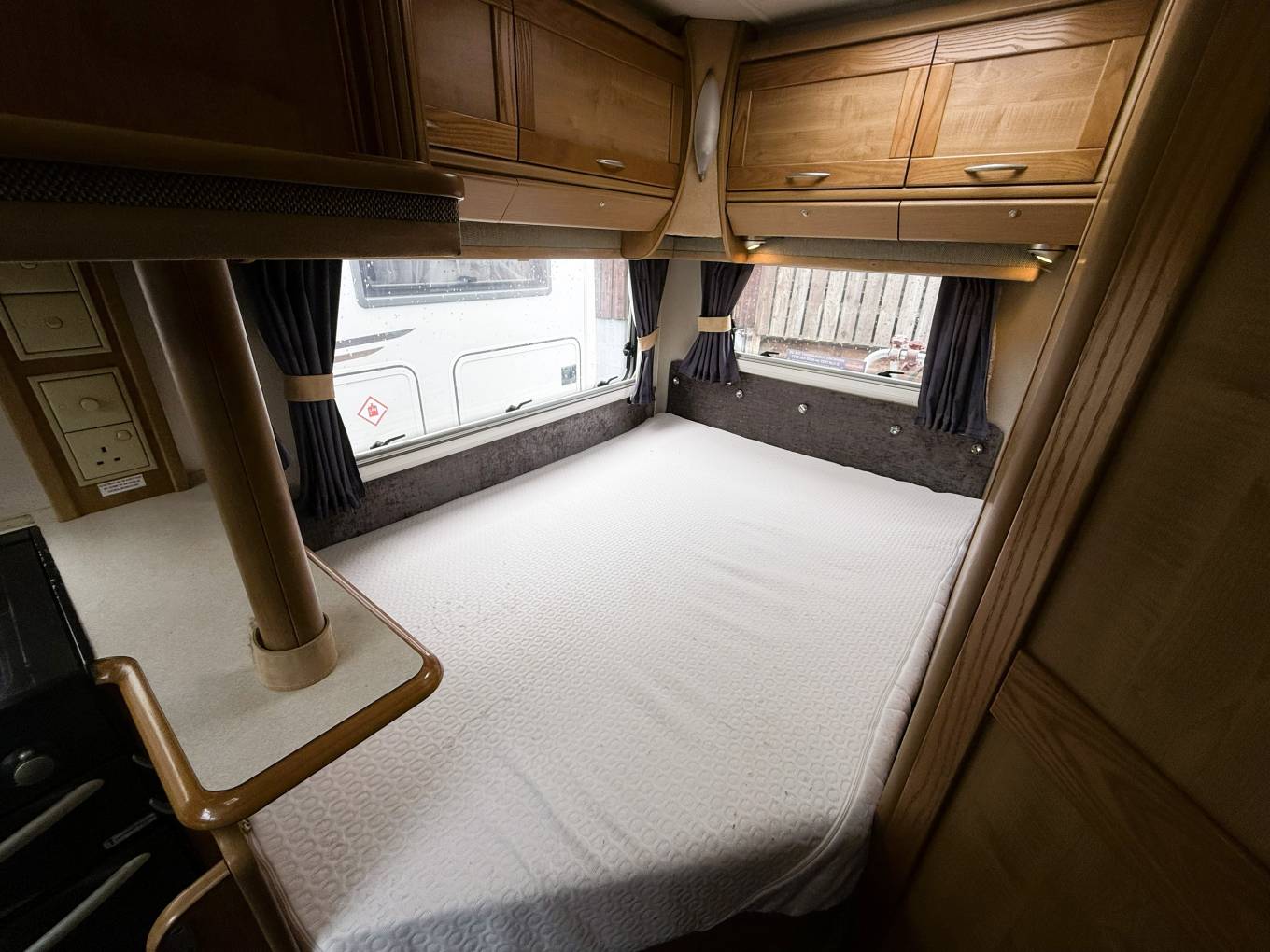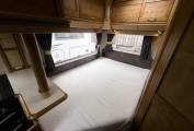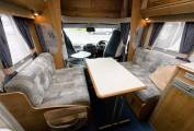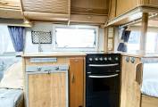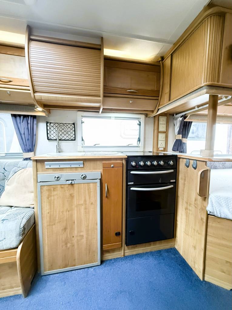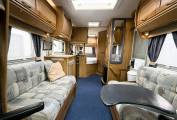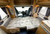 The comfortable lounge area benefits from two side sofas and the two front captains chairs swivel round to provide further seating options. A great place to relax, entertain and dine with the drop in table. At night the two side sofas pull across to provide a second double bed. The kitchen is fully featured with a 3 burner gas hob and electric hot plate with separate oven and grill. A sink with drainer, microwave oven and 3 way fridge with freezer box provide the rest of the equipment. Plenty of storage with overhead lockers, under sofa storage, pull out larder cupboard and a double and single hanging wardrobe with drawers. Further storage under the rear fixed French bed. To the rear is the large double bed with washroom to the side with flushing cassette toilet, sink and vanity and separate shower.
