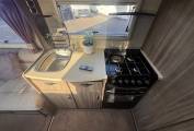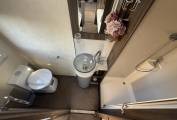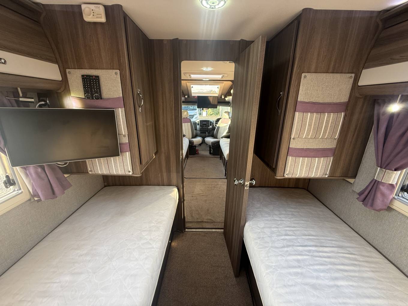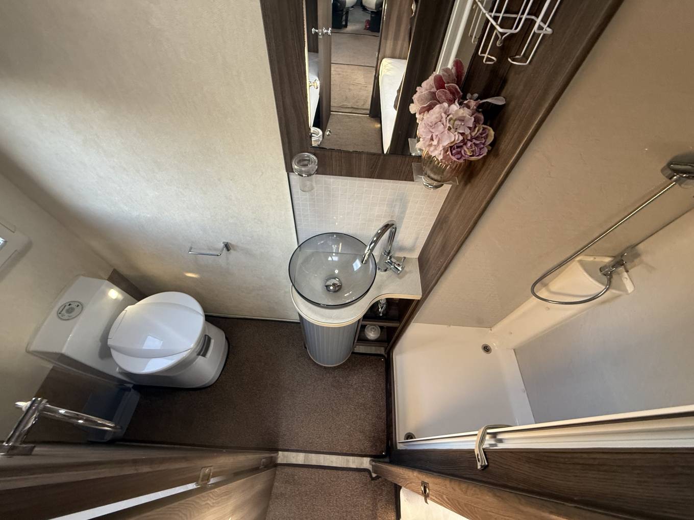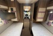 Beyond the kitchen is the bedroom with twin fixed single beds, both have large storage beneath along with a half robe to the foot of each bed and roof lockers on either side. Through the next door is the luxury full end full width washroom en-suite which has a large shower cubicle with extractor fan, vanity unit with wash basin and a cassette toilet.