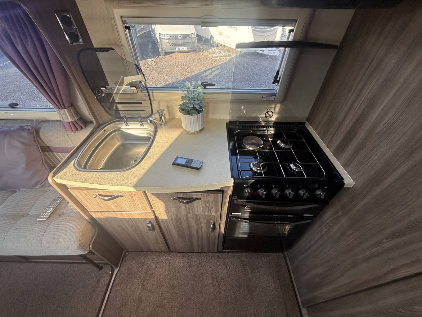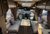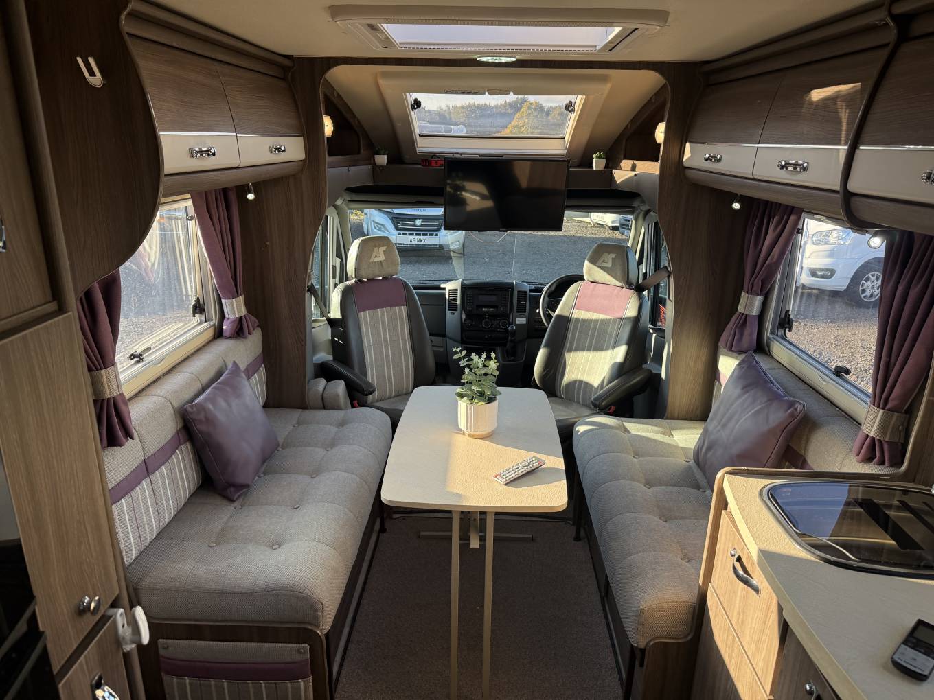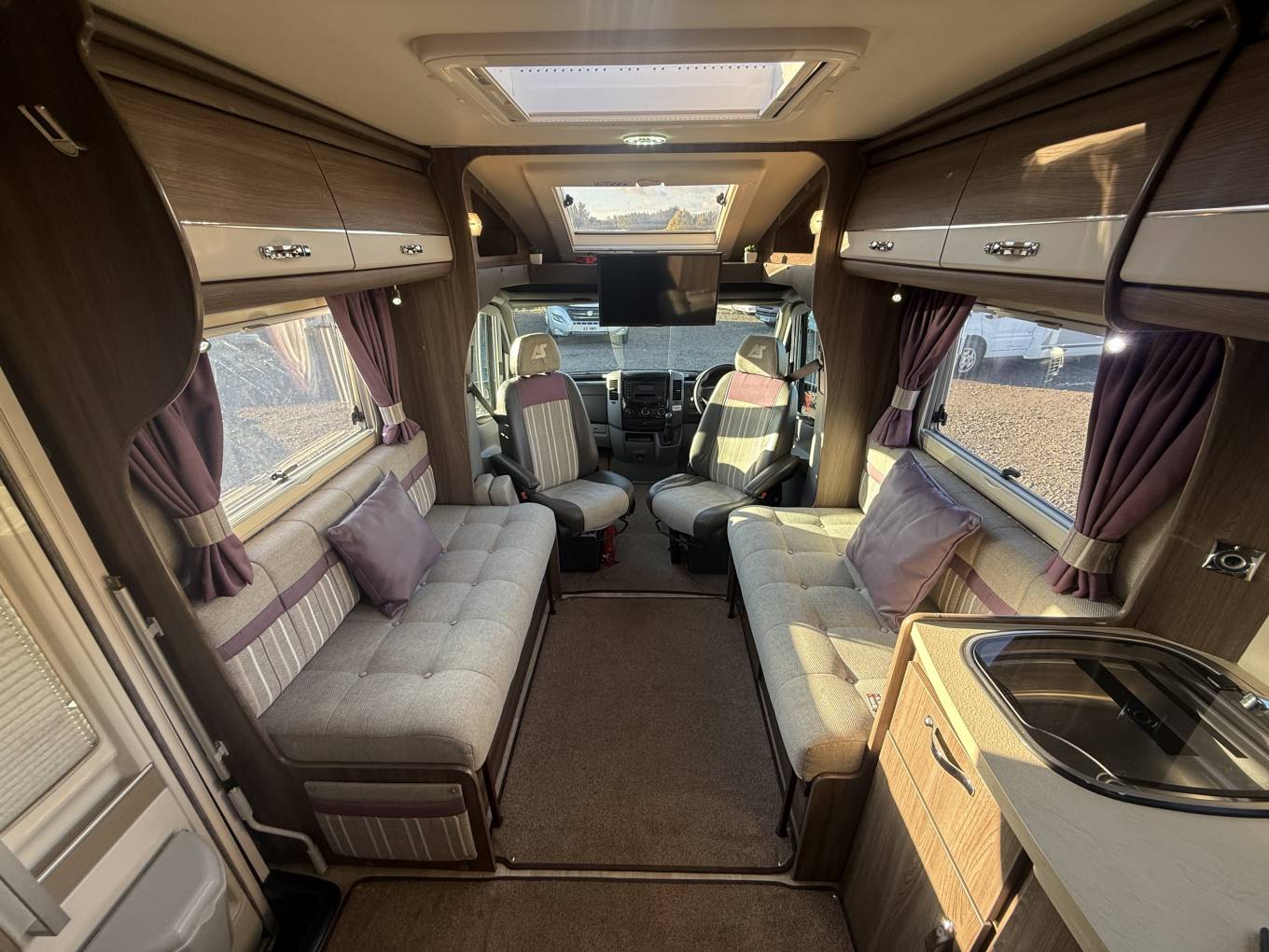 The layout is from the front you have a large dining area with a foldaway table for dining or relaxing with twin facing sofas which can convert to a double bed and 2 cab swivel seats. Further back you have a central kitchen has which has everything you require including a large fridge freezer, microwave, full cooker with gas oven, grill, 3 burner hob and single electric hot plate, sink with drainer along with lots of storage and worktop space. In this area there is a Dometic Air Conditioning system fitted.