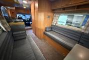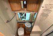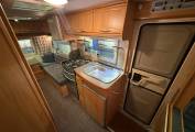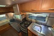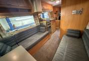 Firstly, we start at the rear lounge which is flooded with natural light from the triple aspect widows. The rear lounge is the perfect place to relax during the day and when the night draws in it can be converted to a comfortable double bed. As we walk forward through this spacious Motorhome we arrive at the kitchen which consists of a gas hob, grill, oven and 3 way fridge. Opposite is the washroom complete with shower, toilet and wash basin. To the front is a comfortable dinette for 2 which is ideal for a short stop. The dinette also converts to a single bed completing the 3 berth.