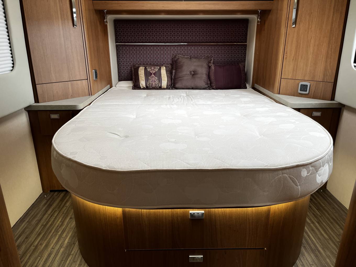 Sleeping – Rear fixed Island bed, very comfortable with wardrobe lockers to each side and overhead storage. Plug sockets, LED lighting and flyscreens/blinds and Curtains. There is a partition door allowing a private bedroom