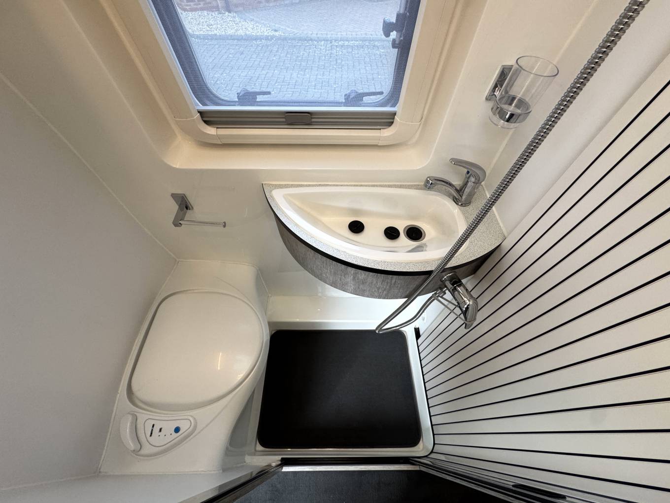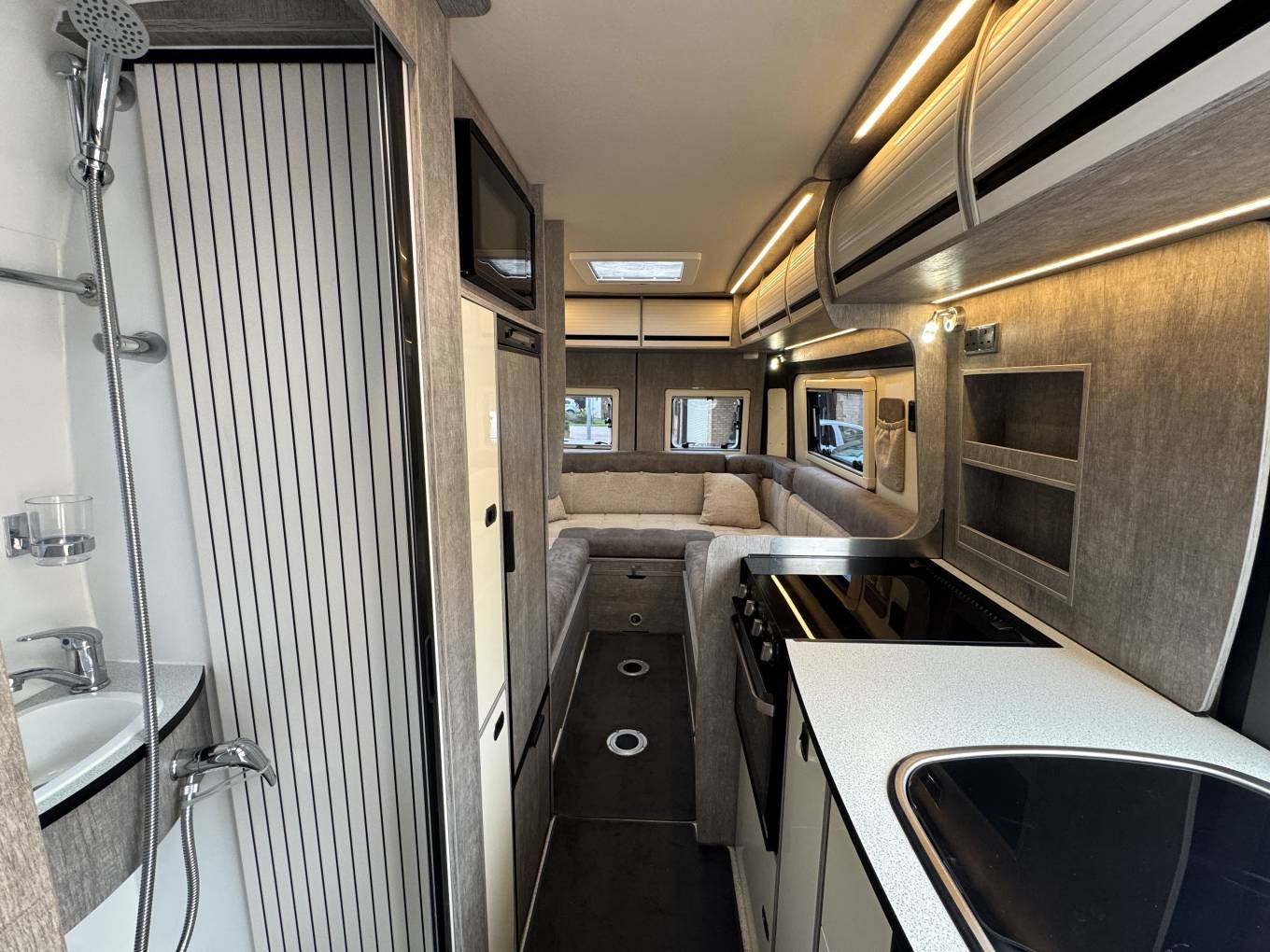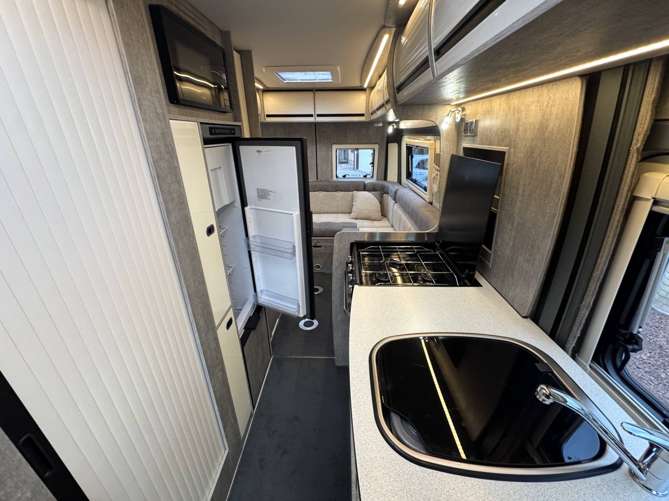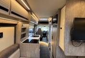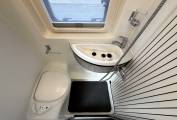 This motorhome is built on a 3500kg chassis with a 2.2 litre manual diesel engine, which means it can be driven on a standard driving licence. The Europa layout offers a rear lounge that converts into either two single beds or a large double, providing flexibility and comfort. The central kitchen is fitted with oven, hob, fridge and sink, while opposite sits the washroom with toilet, shower and basin.