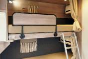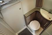 With the two cab seats swivelled there is plenty of room for four in the dinette, with the option of making a side settee, or two forward facing rear seats, opposing a choice of pedastal table positions. The midships kitchen is compreshensively equipped including large fridge freezer, gas hob, oven and grill, microwave, plus excellent storage and workspace for this size of vehicle. The rear corner washroom features toilet, shower and vanity sink, neat storage and lighting. The side bunks are well thought out, each with its own lighting and storage, both substantial and suitable for adults, the upper one can be hinged up for more space if required, while the lower bunk has a range of drawer storage underneath.