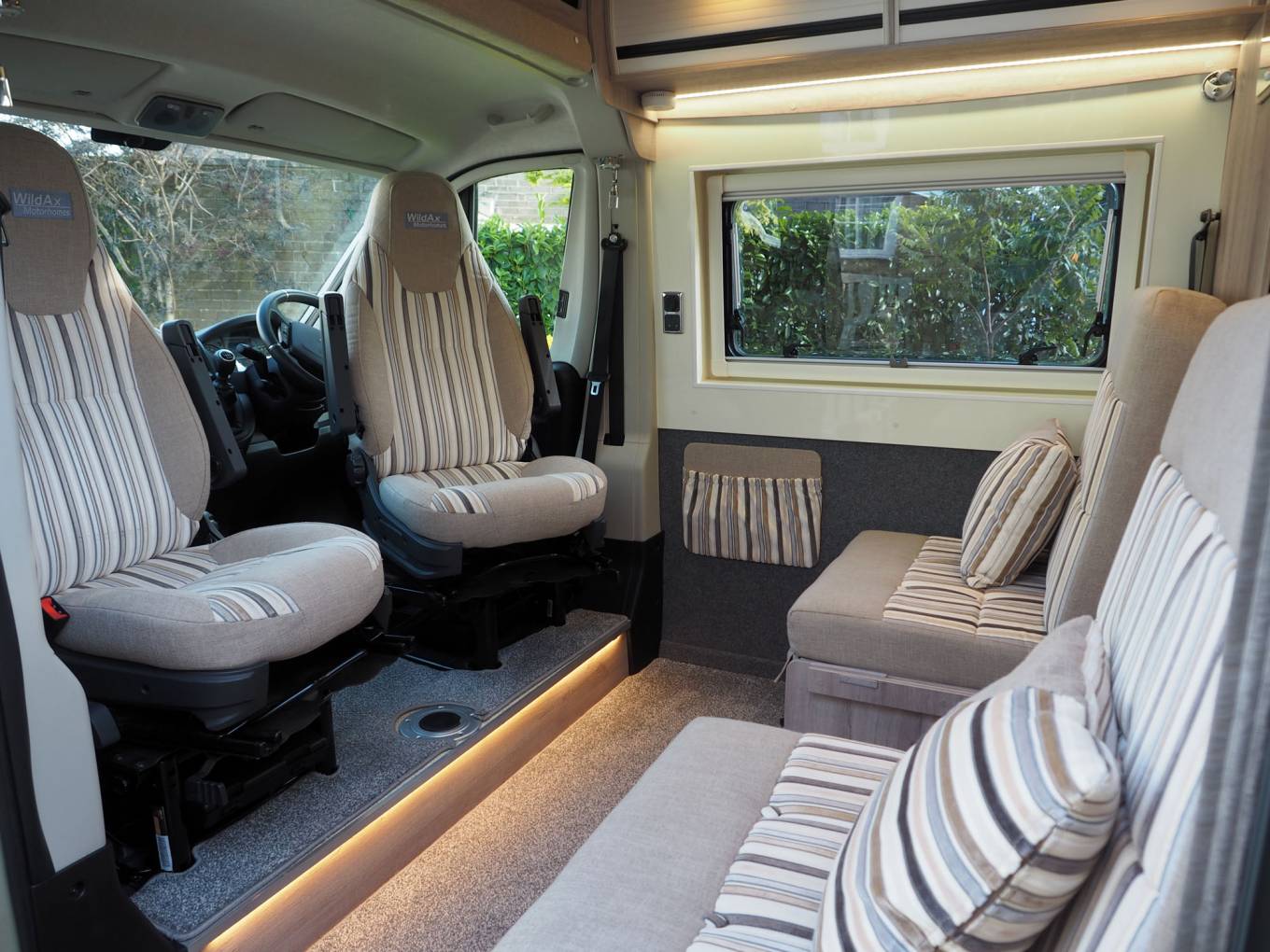 Unmarked condition prestige family hightop campervan by Wildax, offering exceptional conversion quality throughout and a versatile design, including a pair of substantial bunks and two options for dinette seating layout. The 6.3 metre 4 berth Solaris XL has 4 x 3 point seatbelts in total. Plated at 3500KG, it can be driven on a standard car licence.