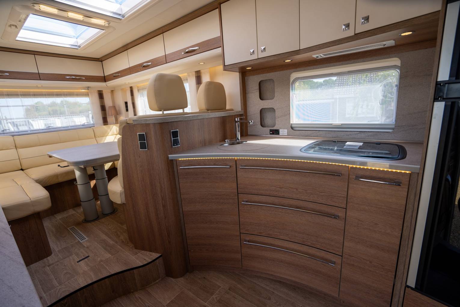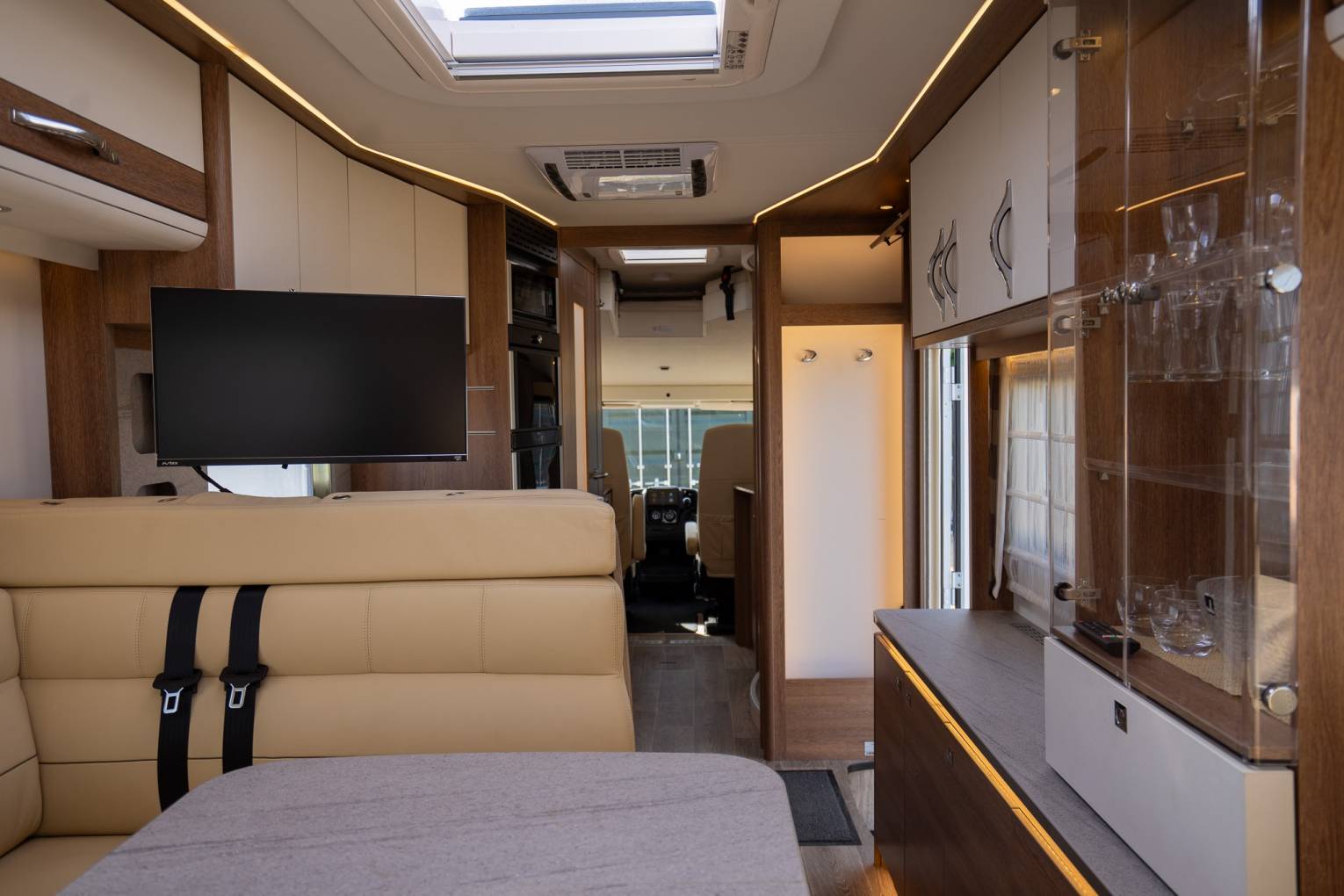 Spacious and Sophisticated Living: Step inside and be greeted by an open, airy living space designed for ultimate relaxation with a roof mounted air conditioning unit.. The attraction of the Alpa is the huge rear lounge, which is rare for a German manufacturer. With a U-shaped layout right across the back of the vehicle, the I 7820-2 can comfortably sit six or even seven around the table, all finished in the upgraded Skylight Leather plus with a pop up Avtex TV making it an entertainer’s dream. The lighting system has been utilised which indirectly illuminates wall and floor elements. This is extremely effective in creating an atmospheric ambience, while Two Large panoramic skylights in the living area offers an abundance of natural light rarely found in a motorhome.