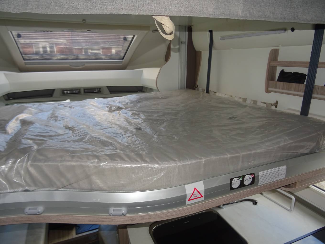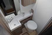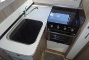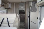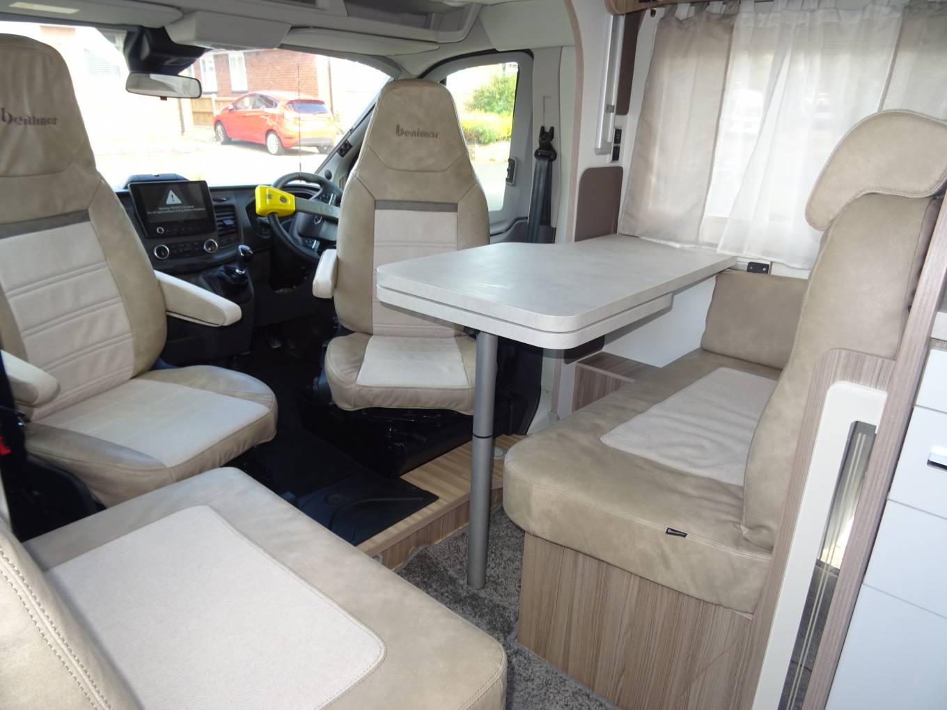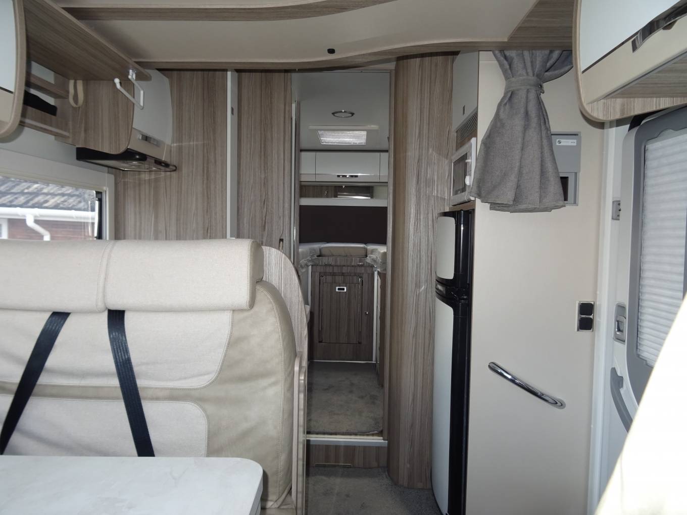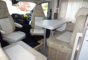As you enter the side door moving to the front you have the spacious dining / lounge area that have 2 rear seat belts and comes with a removable table. Both front seats swivel round making this a nice area to relax in. Above this area you have an electric drop down bed that is easy to set up and a good size double.