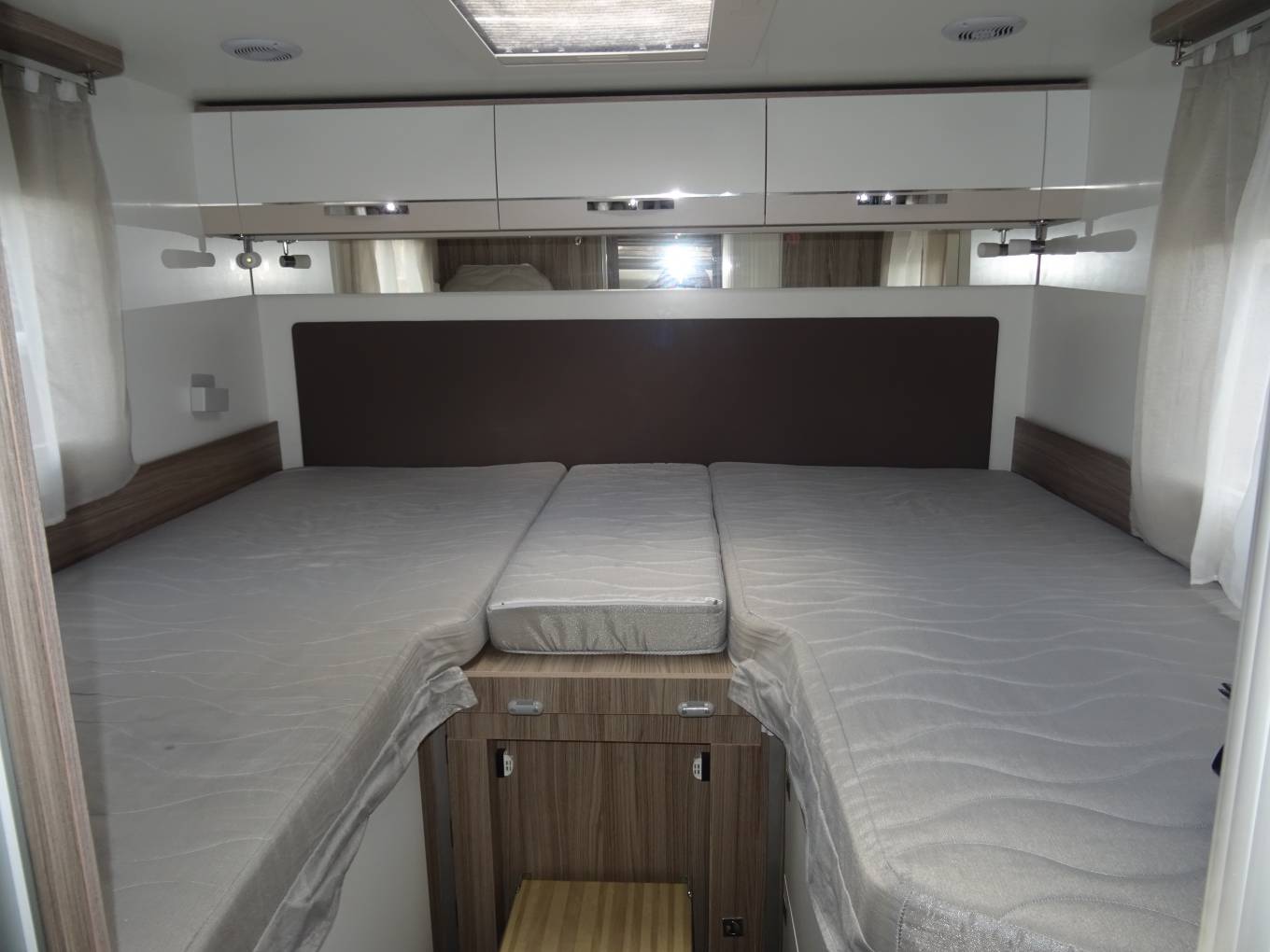To the back are twin fixed rear beds that can be converted to a double bed with a large garage space underneath with 2 large doors each side.