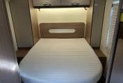 At the rear of the motorhome is the bedroom featuring the Island bed, wardrobe to the left and cupboard with shelves to the right. There is a skylight above and windows either side.