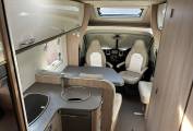 To the right is the dining area with a forward facing bench seat, a single side facing seat and a large table. The bench seat has 2 seat belts. The 2 front captain seats swivel to create a comfortable entertaining space for families and friends. There are storage lockers above, a large skylight above the cab that floods the van with natural light.