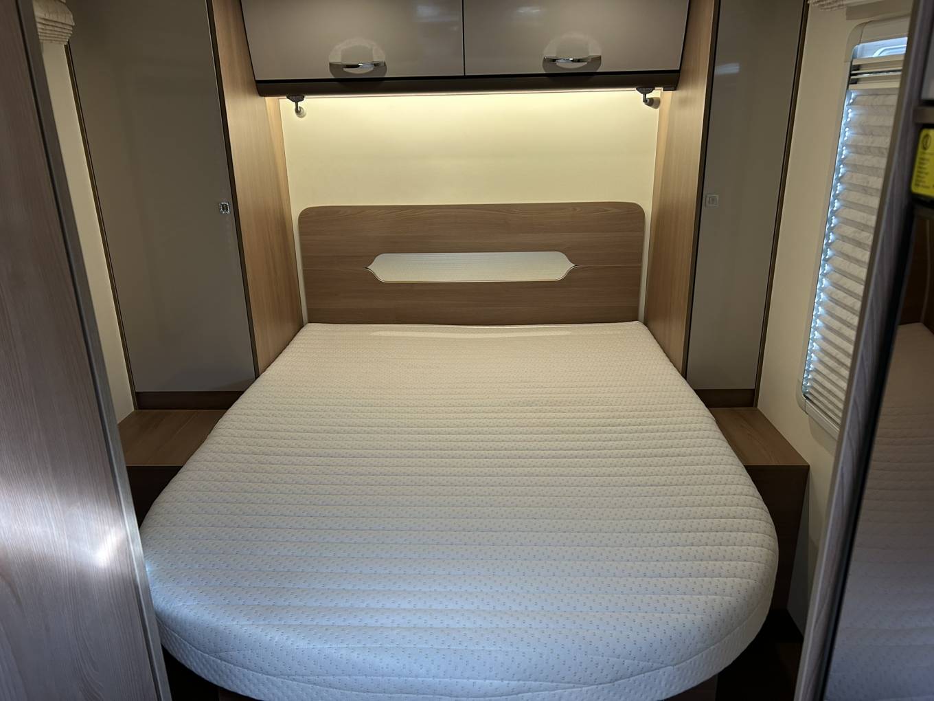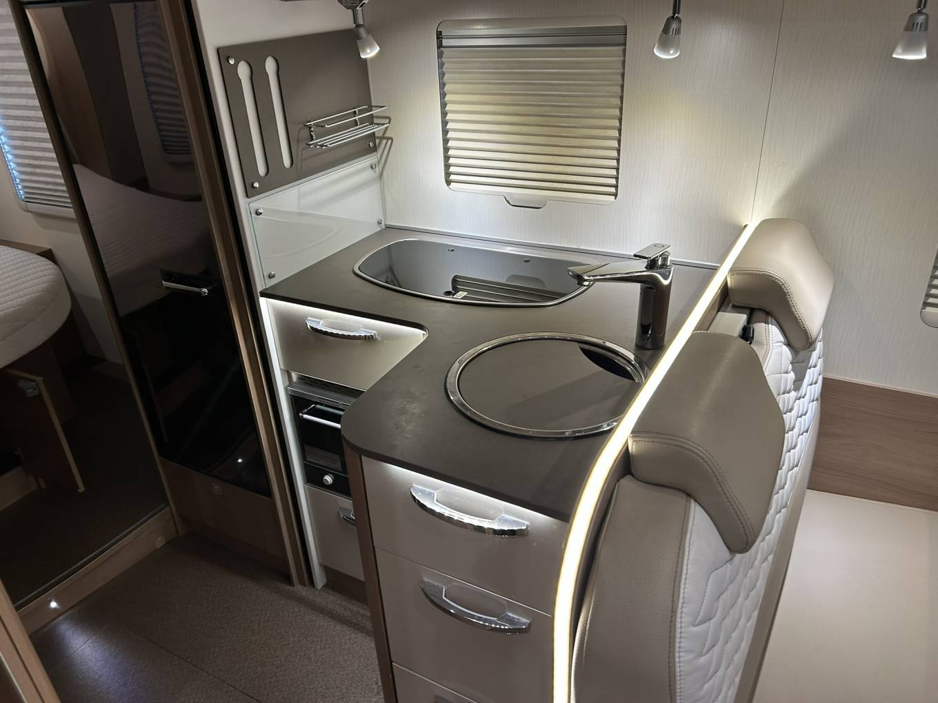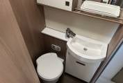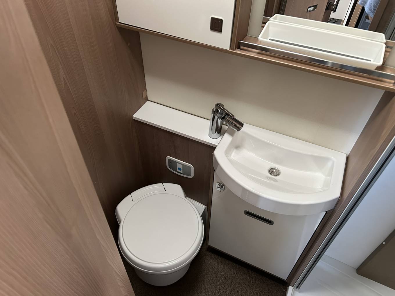 To the left of the kitchen you will find the spacious washroom with hand basin/vanity unit, shower, mirror and cassette toilet.