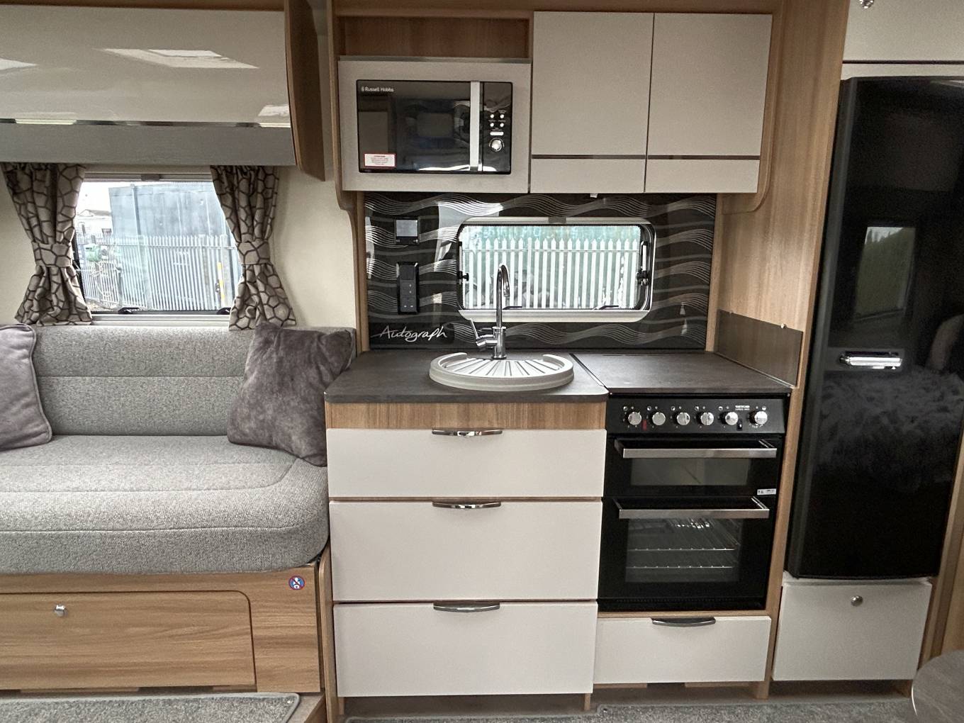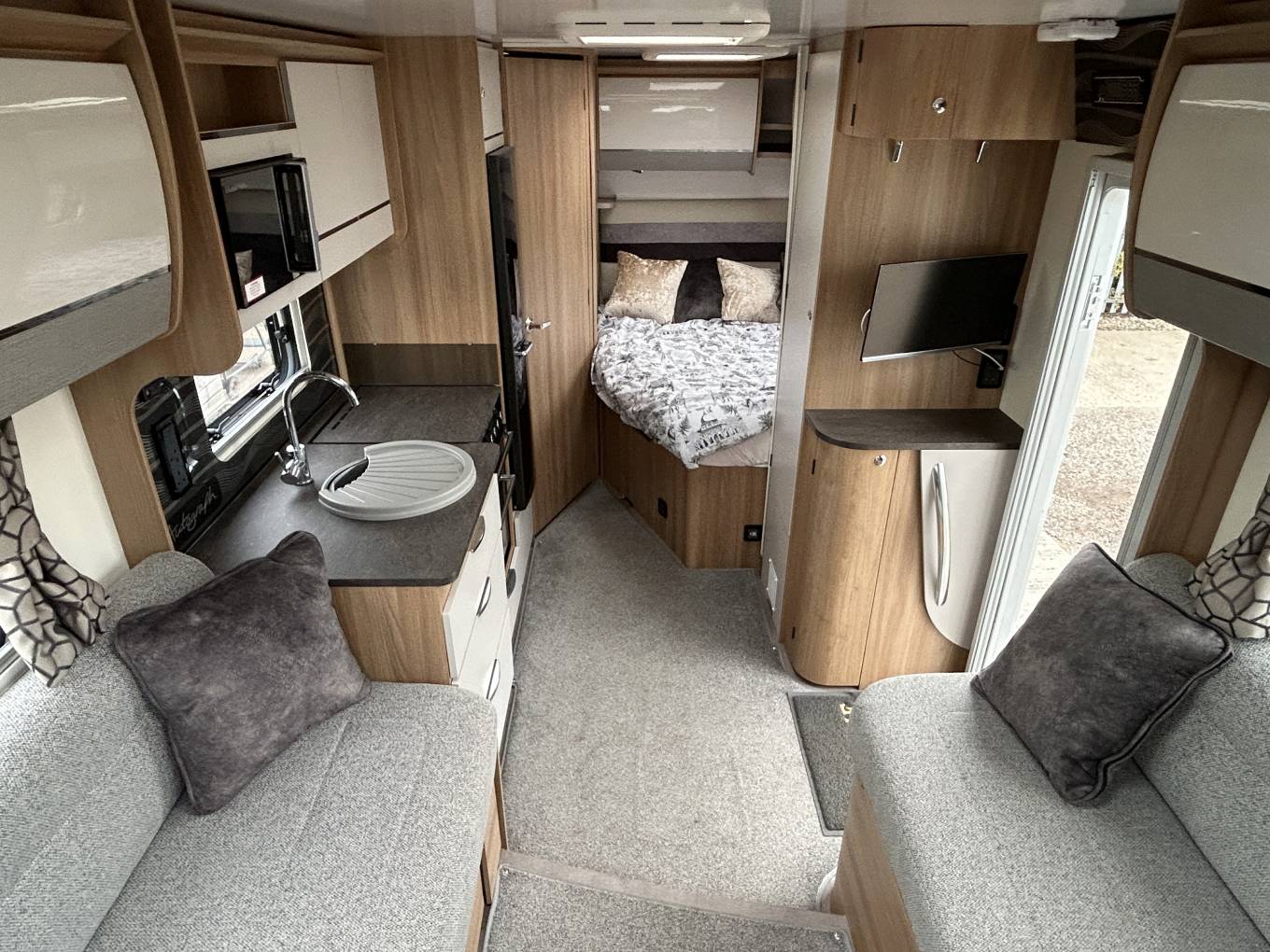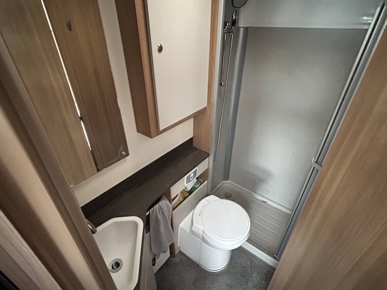 The fully equipped kitchen includes a large fridge, microwave, oven (never been used), grill, and hob, along with stylish finishes like a branded Perspex splashback and a stainless-steel sink. A well-appointed washroom with a separate shower adds to the feeling of home-from-home luxury, while the superb Alde heating system, complete with touchscreen controls, ensures you stay warm and cosy whatever the season.