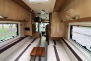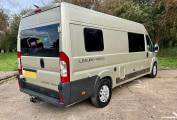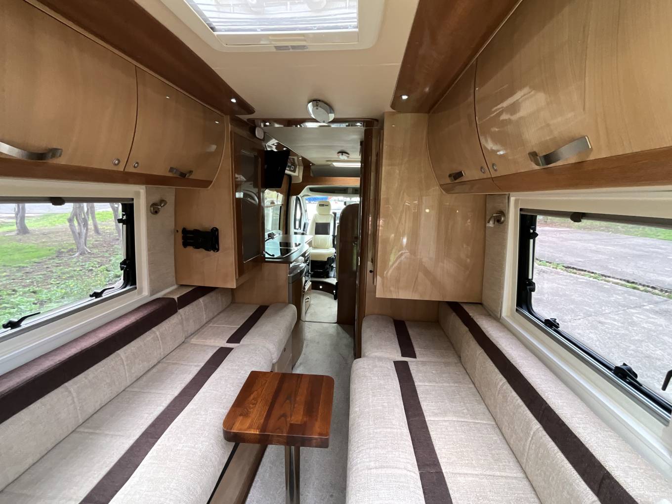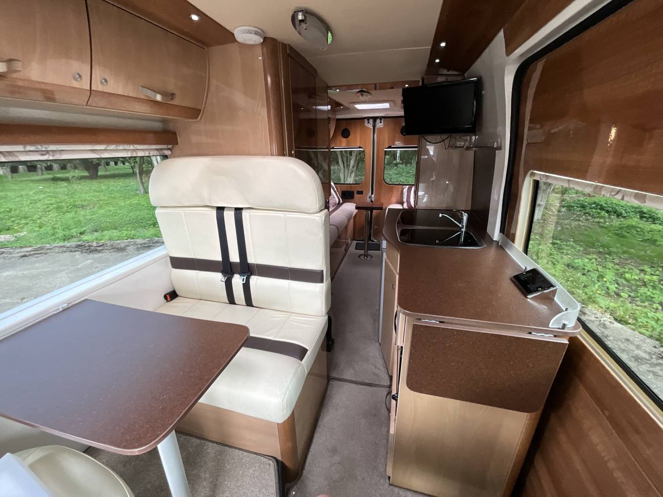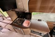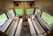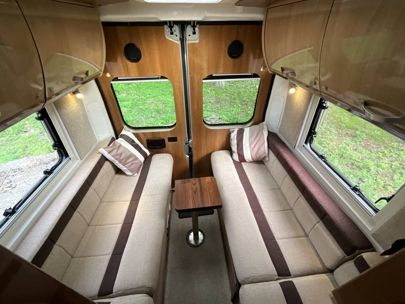 Starting at the rear of the campervan you will find the light and airy lounge area featuring two long bench seats with both doors to the rear opening fully to sit and enjoy your evening looking out at the views. This space is perfect for entertaining or relaxing watching your favourite tv shows at the end of a long day. As the night draws in these easily convert to a large double bed or can be kept as 2 single bed. Moving forward you will find the functional washroom including a pull down wash basin, Thetford cassette toilet, shower and small vanity unit. Adjacent to this is the well equipped kitchen area which includes a Smev combined oven and grill, 3 ring gas hob, sink with mixer tap, fridge with freezer compartment and extendable worktop space. In the heart of the campervan is the stylish centre dinette area with table, forward facing bench seat and two captain swivel seats for additional seating. Throughout this campervan there is plenty of storage including overhead lockers, cupboards and under sofa storage.