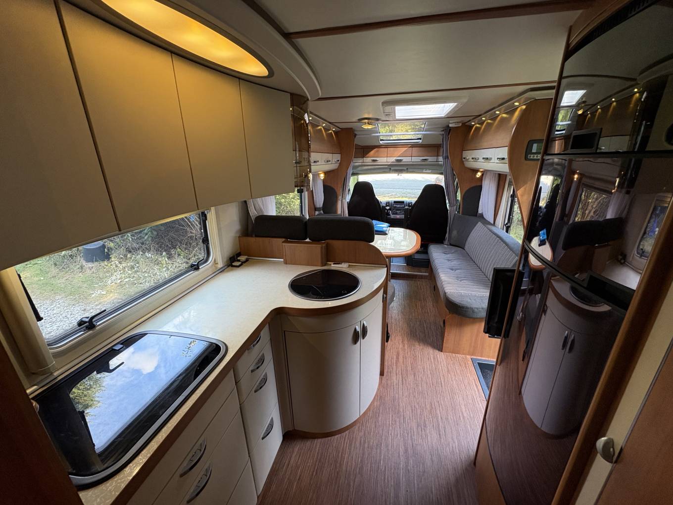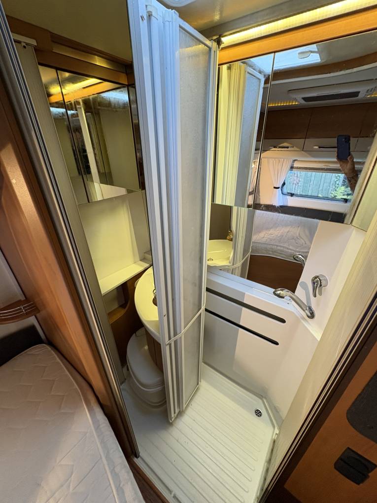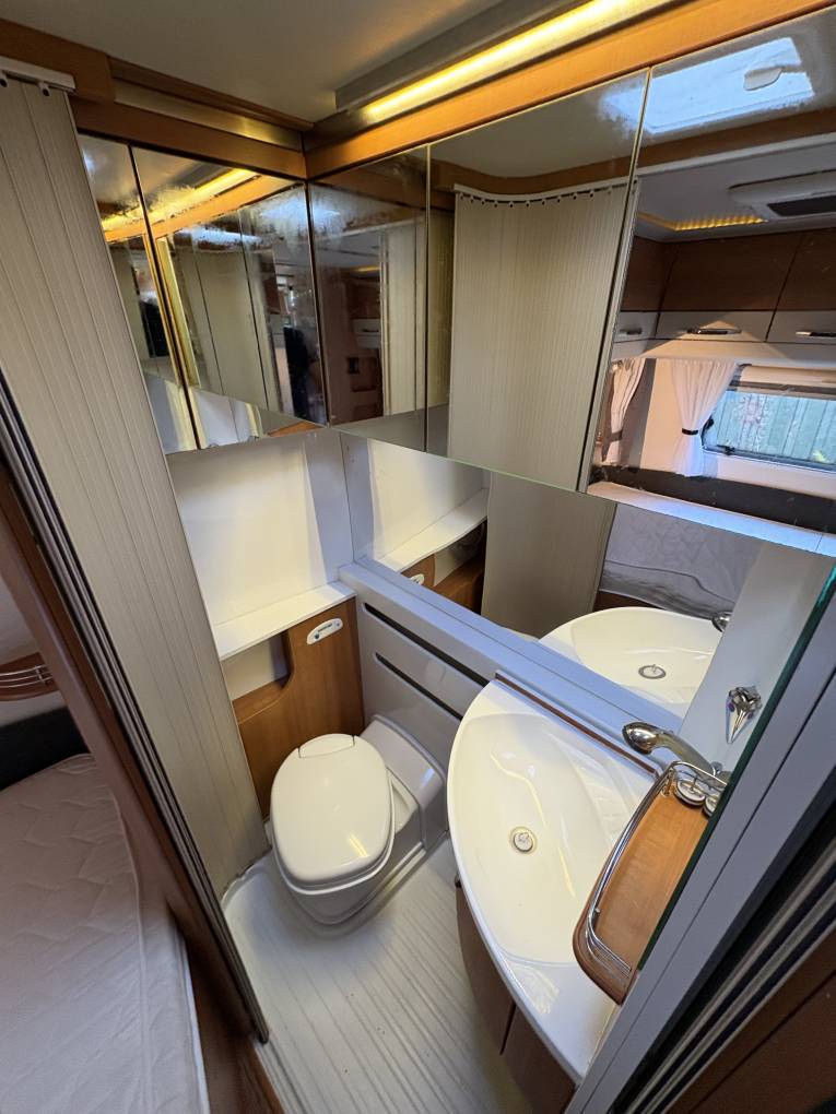 Layout - The Hobby Toskana Exclusive 75 features the French bed at the rear with storage beneath, a shower-enclosed washroom at the rear on the drivers side, a well-equipped kitchen with a large fridge/freezer and oven, a spacious lounge with swivel cab seats and forward facing belted seats. You will also notice the quality of the build inside, the beautiful lighting throughout and plenty of easy of the eye storage cupboards.
