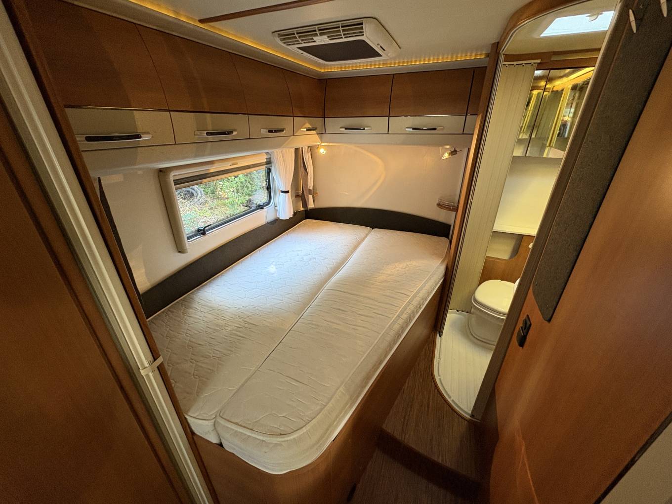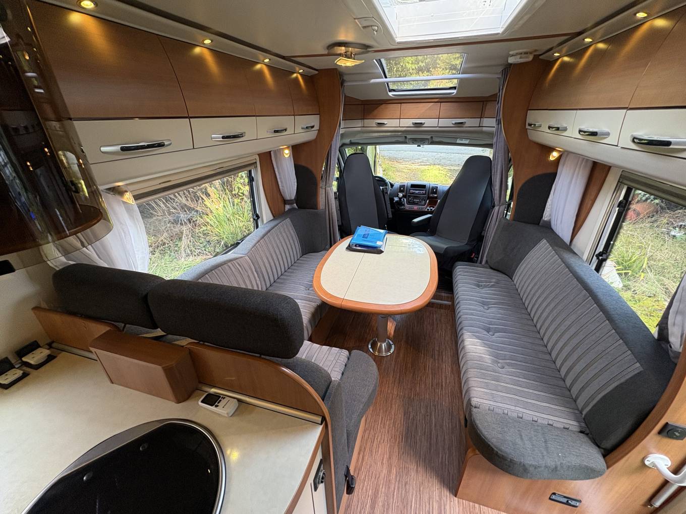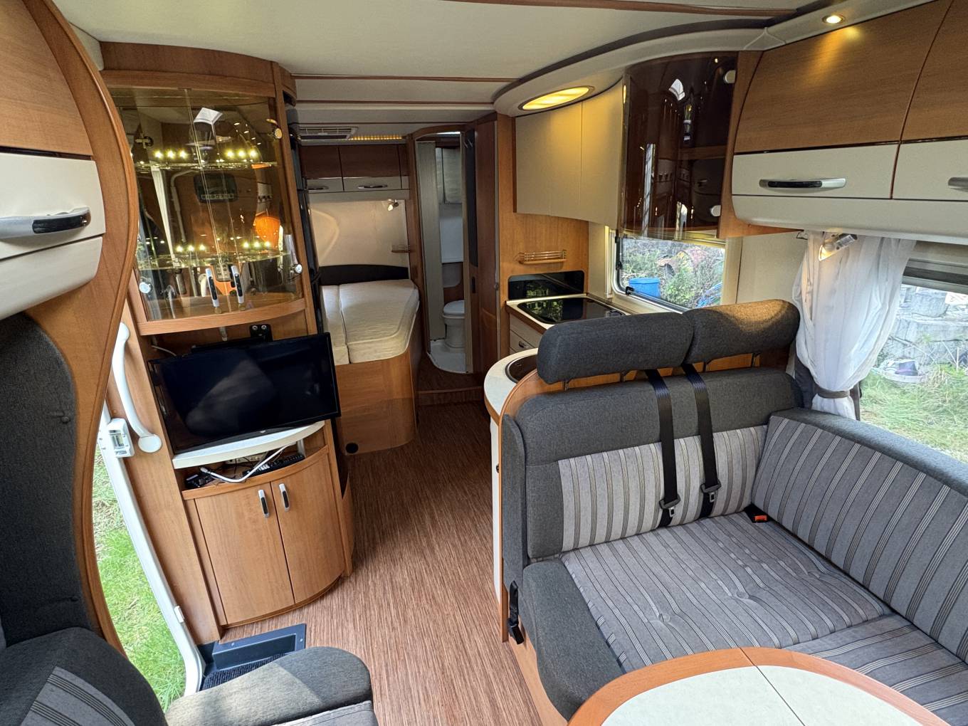 Layout - The Hobby Toskana Exclusive 75 features the French bed at the rear with storage beneath, a shower-enclosed washroom at the rear on the drivers side, a well-equipped kitchen with a large fridge/freezer and oven, a spacious lounge with swivel cab seats and forward facing belted seats. You will also notice the quality of the build inside, the beautiful lighting throughout and plenty of easy of the eye storage cupboards.