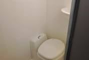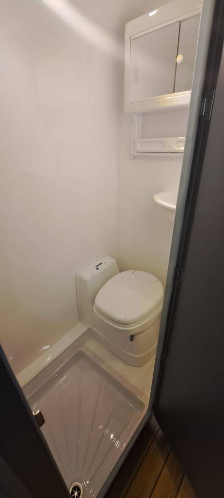 The washroom is illuminated by spotlight LEDs and comes with Thetford toilet with cassette, shower with curtain, vanity unit and storage.