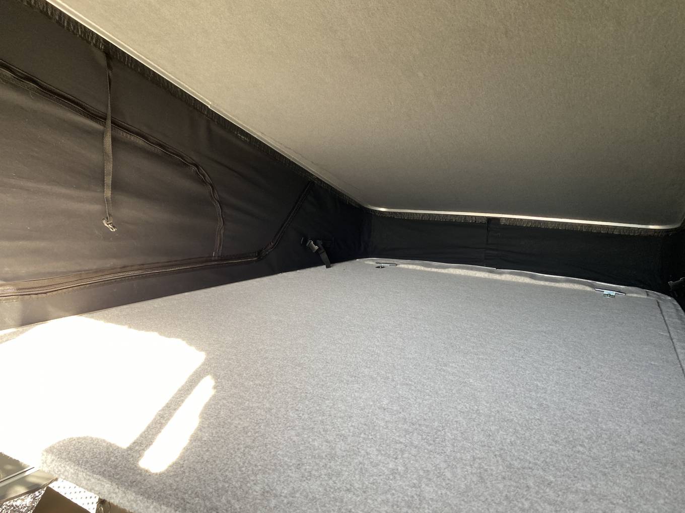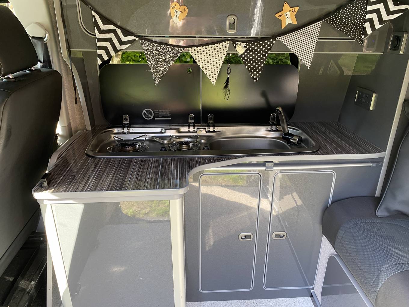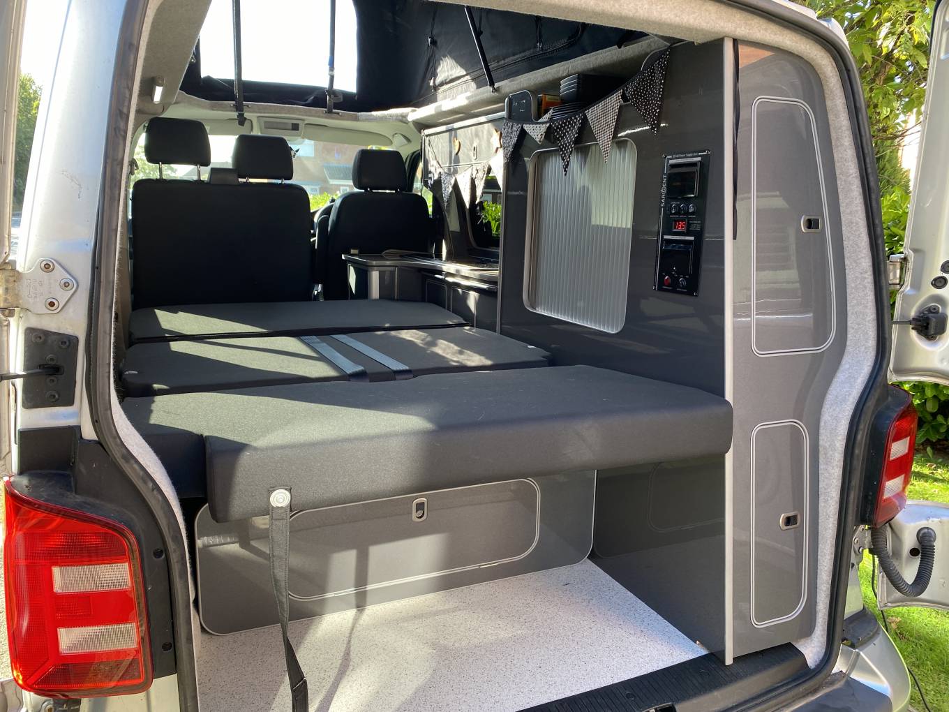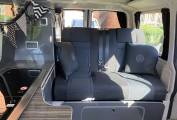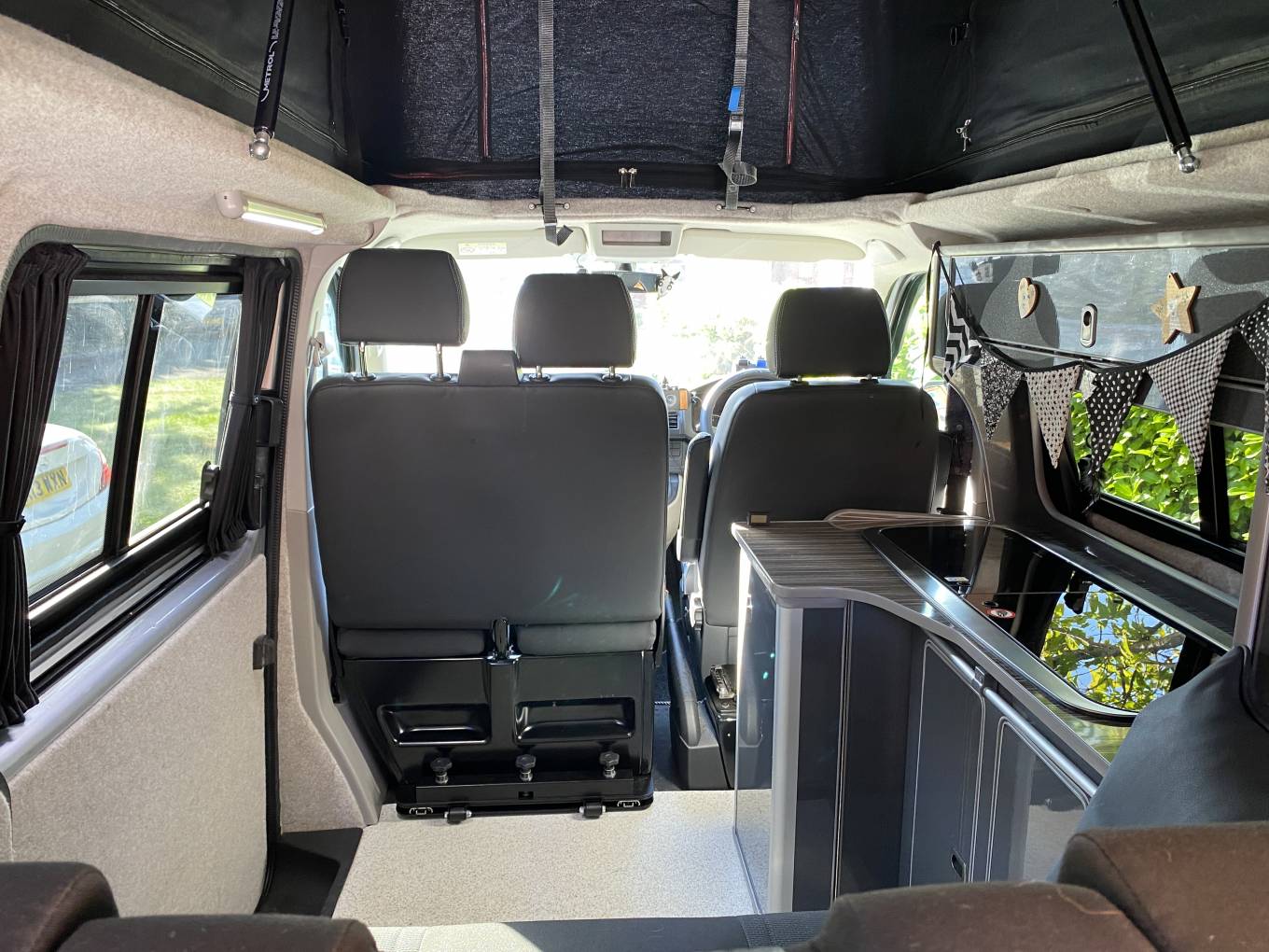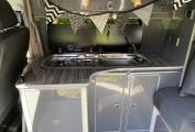 The layout includes a rib bed that folds flat into a comfortable double, plus a pop-top roof that provides standing height and an additional sleeping area for two. The kitchen has a double gas burner hob, sink, fridge and storage cupboards for your essentials.