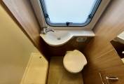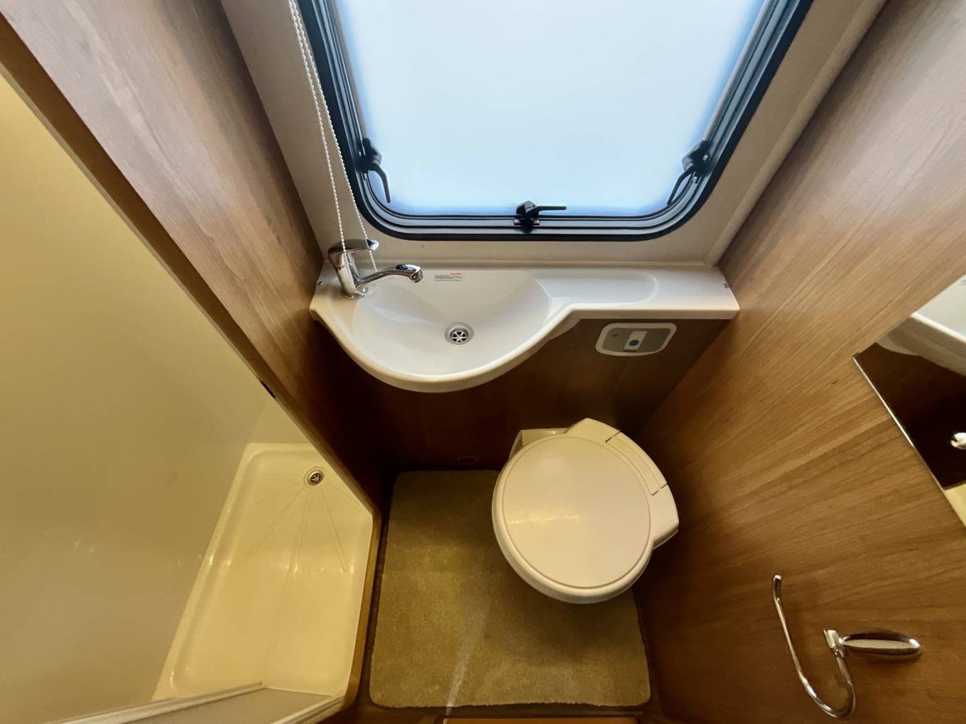 Opposite the kitchen, the spacious washroom has a separate shower cubicle with screen door, Thetford toilet with cassette, wash basin and vanity unit.