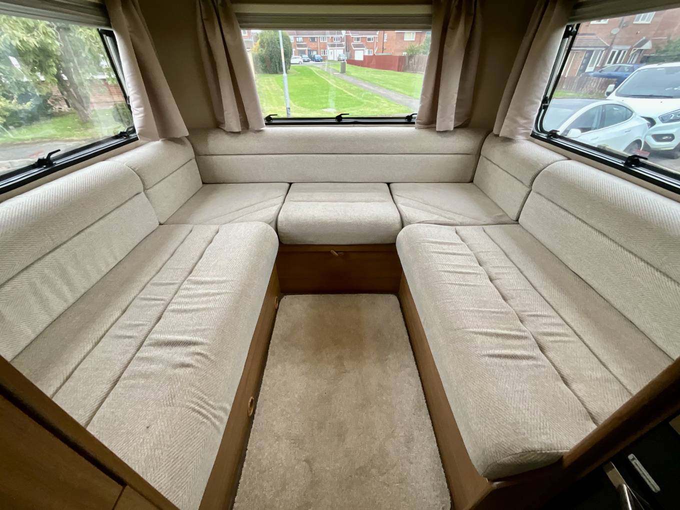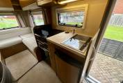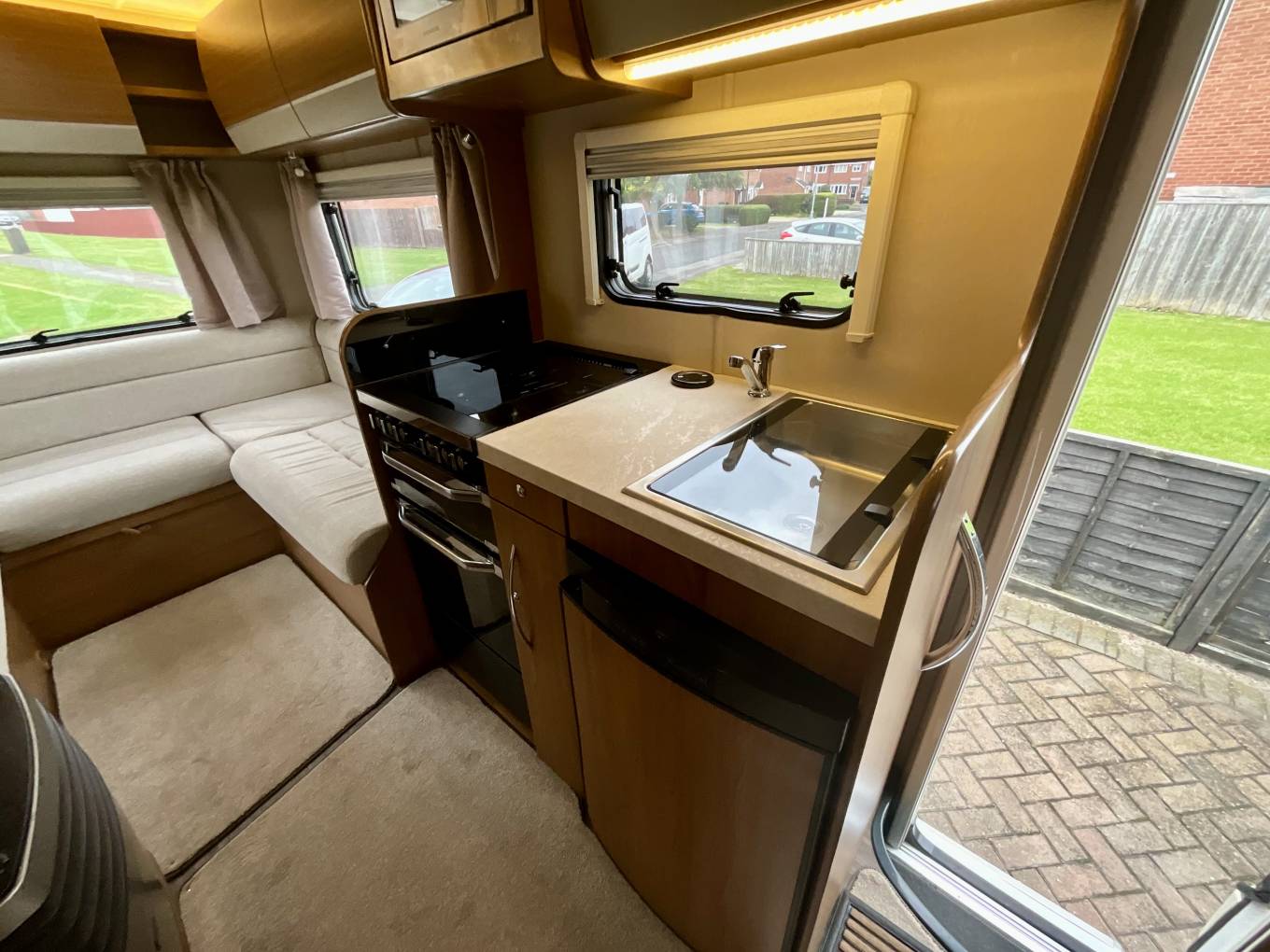 The kitchen comes fully equipped with Thetford oven/grill with gas hobs and electric hot plate, three way fridge/freezer, sink with hot and cold water, microwave, and three slide out 240v sockets for higher powered items. There is also plenty of storage throughout the kitchen.