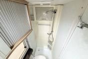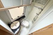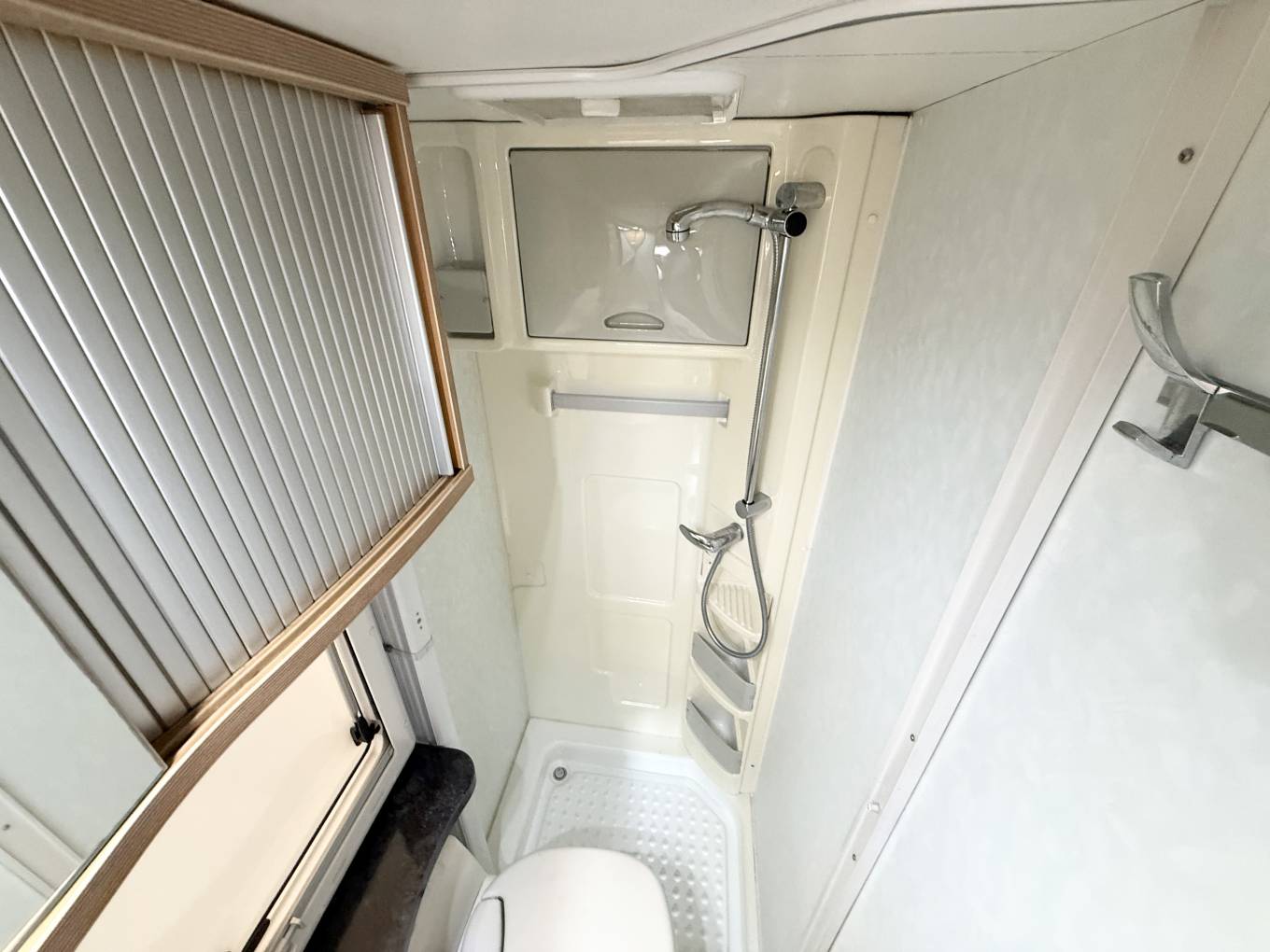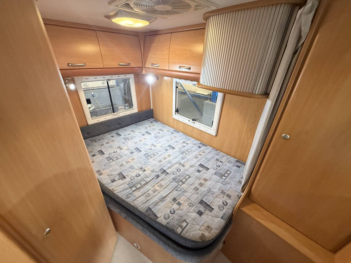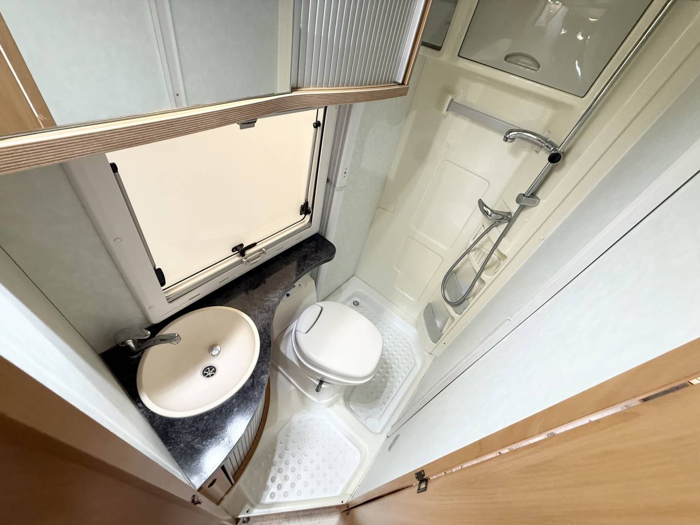 Adjacent is the washroom, with electric flush toilet, washbasin, storage and shower area with folding screens.At the rear is the permanent double bed with storage below, overhead lockers & wardrobe either side.