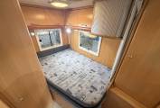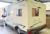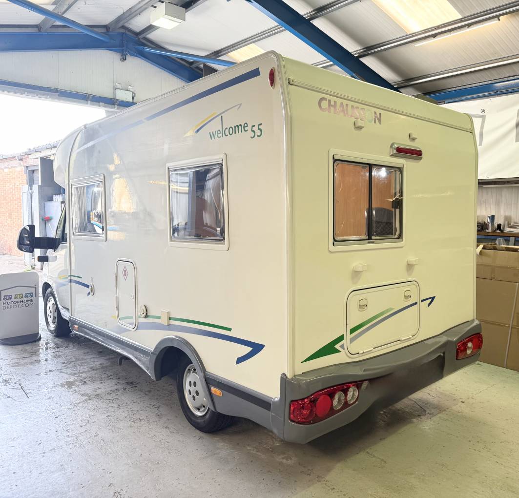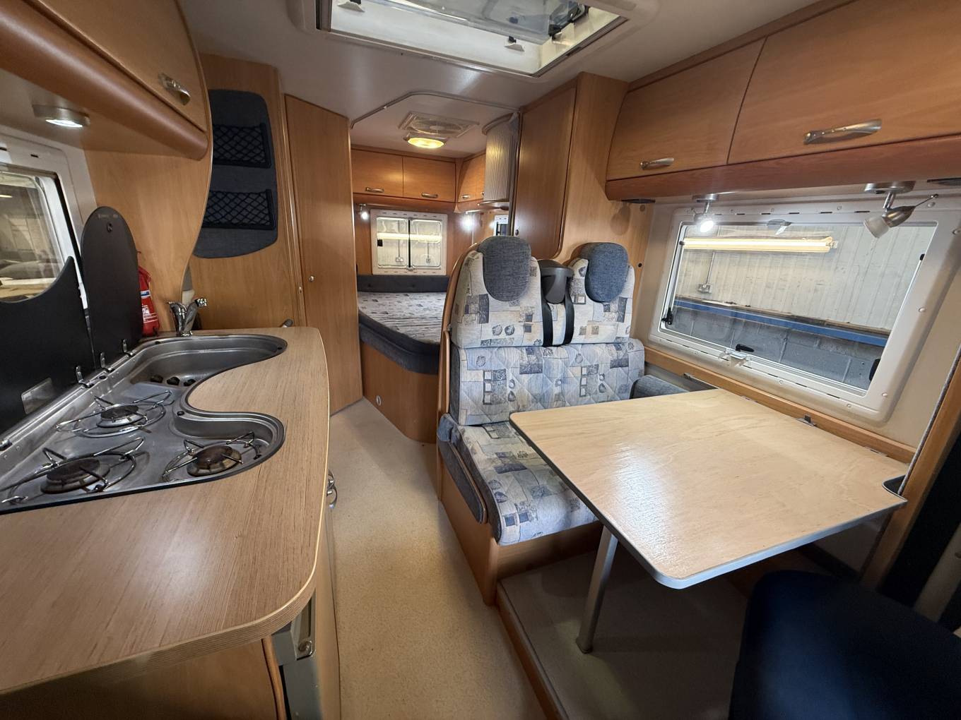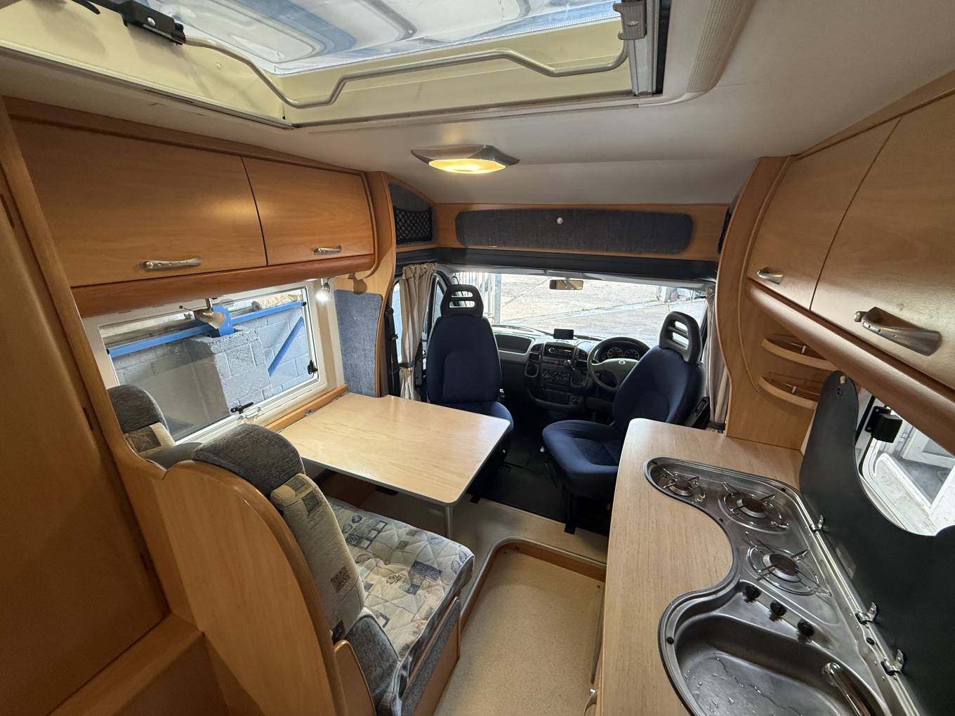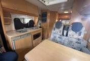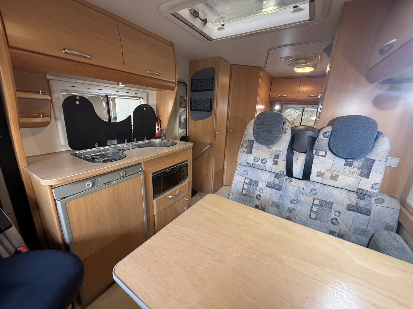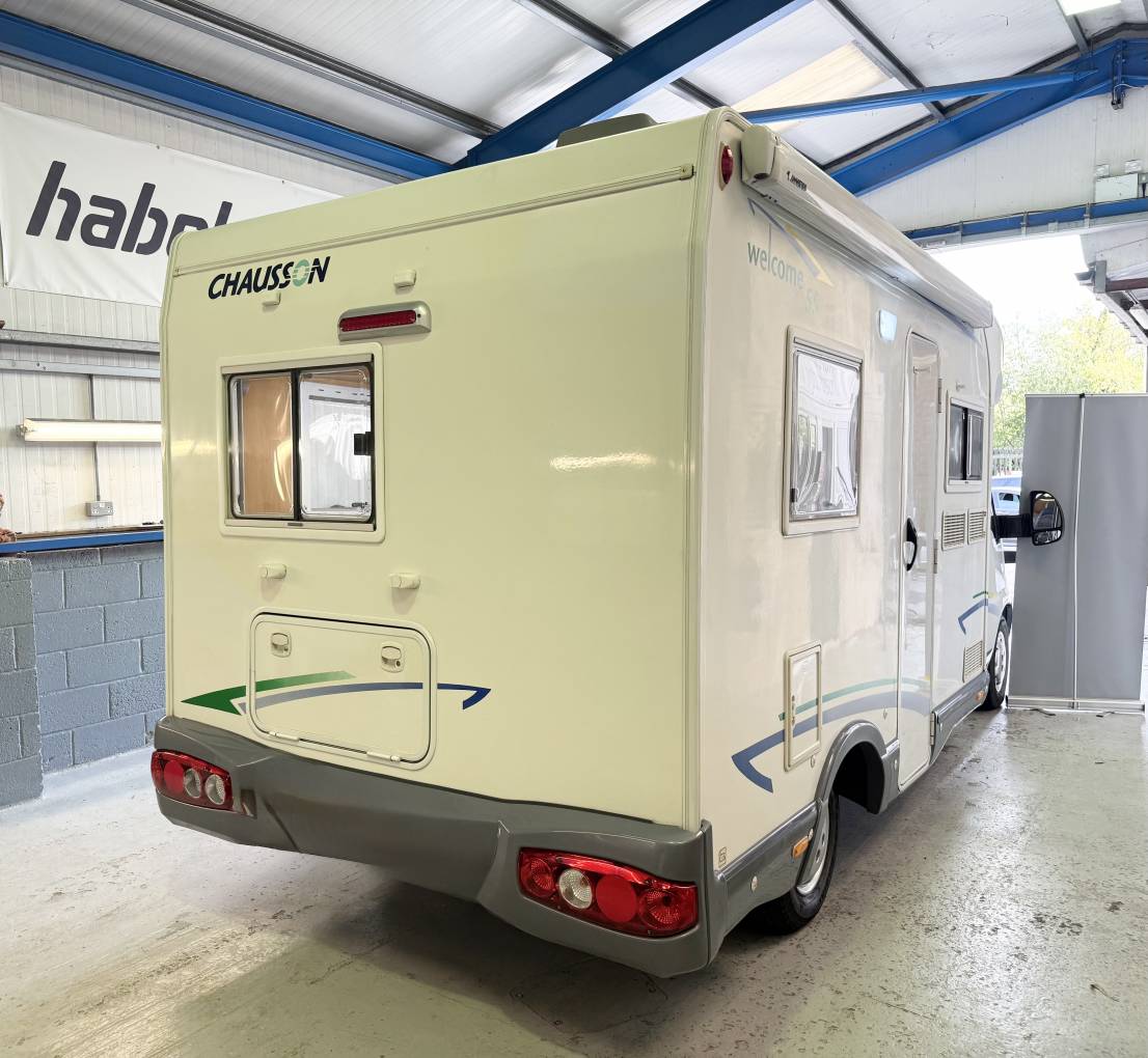 A beautifully kept Chausson Welcome 85 low profile, 4 berth motorhome, based on the Fiat Ducato. At the rear of the motorhome is a fixed double french bed which lifts to reveal extra storage. Adjacent to the bed we have a good sized bathroom with hand basin, wc and a shower facility. The kitchen is equipped with a fridge and separate freezer, a three ring gas hob, grill and a single bowl sink. Behind the drivers cabin we have the lounge area with captains seats and adjustable dinning table. It also comes with 4 Seat Belts,
