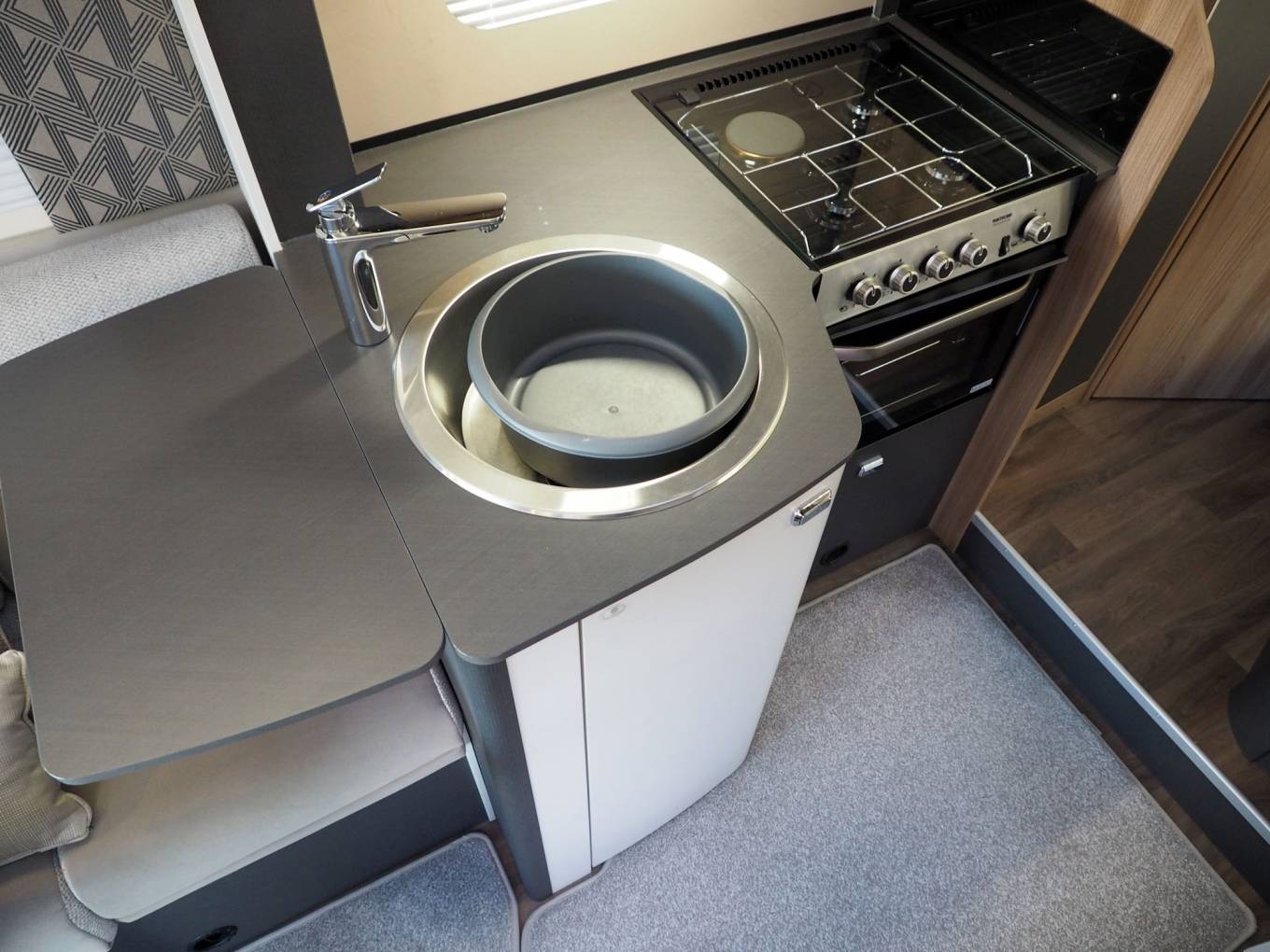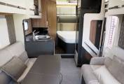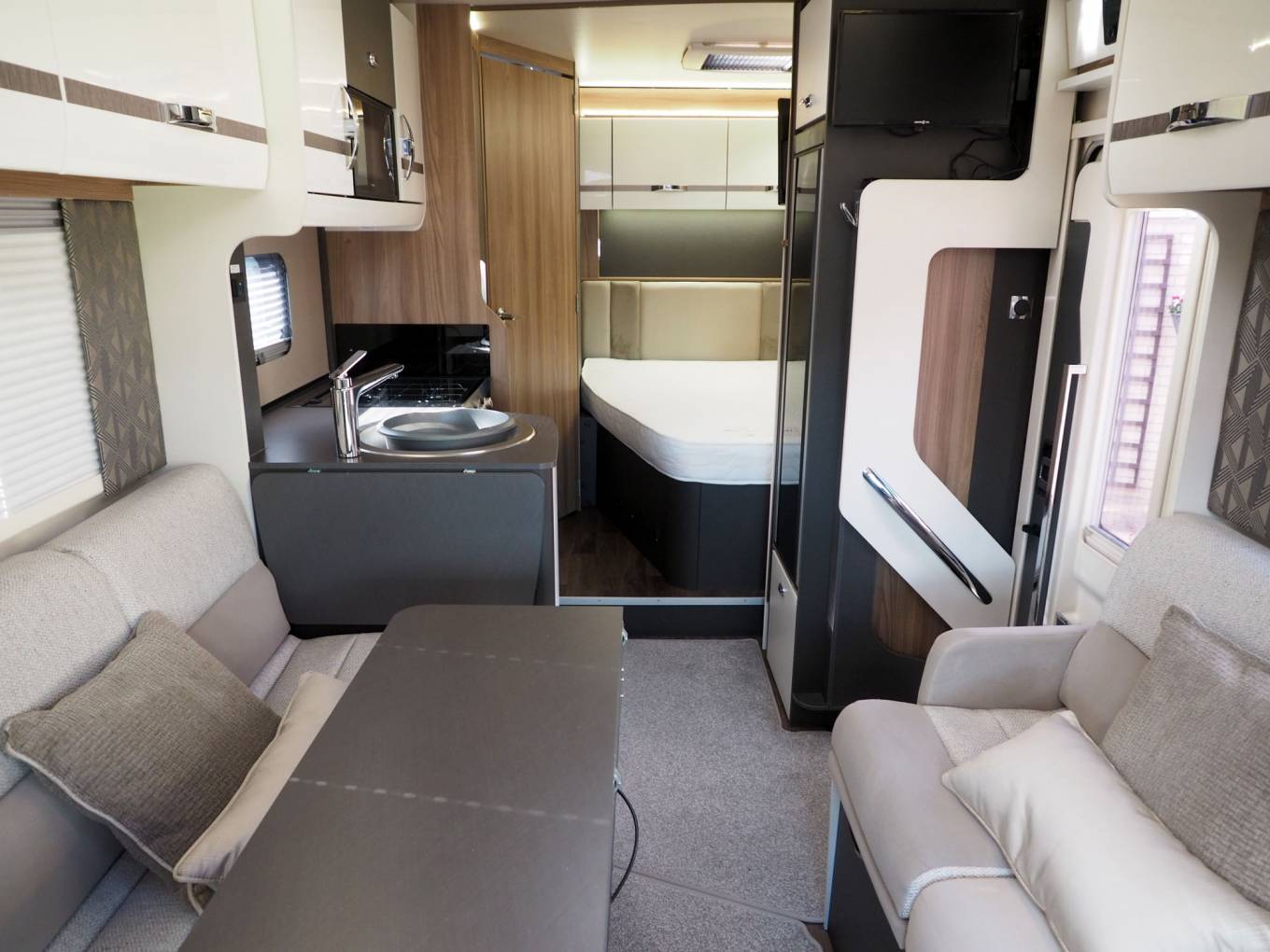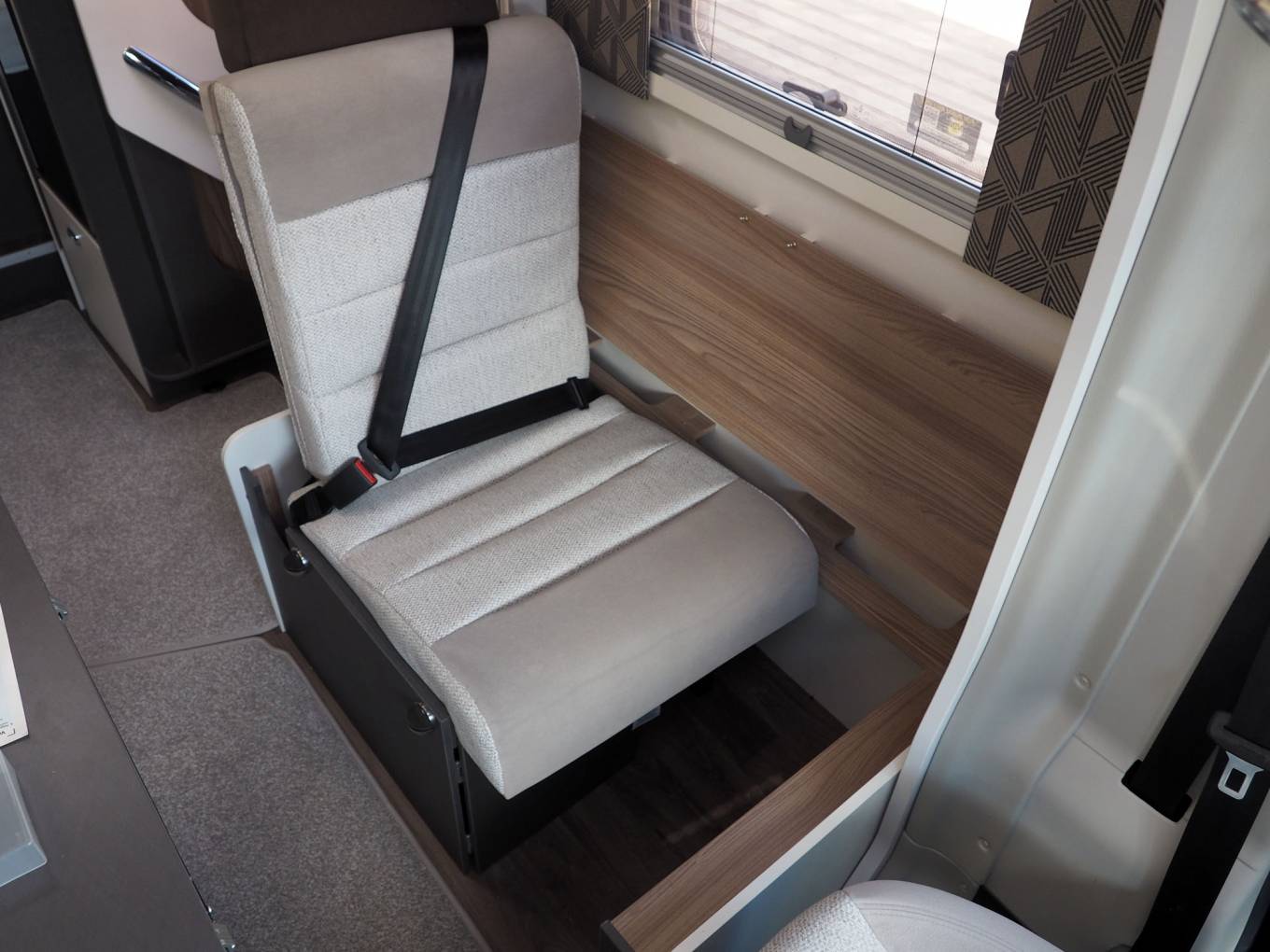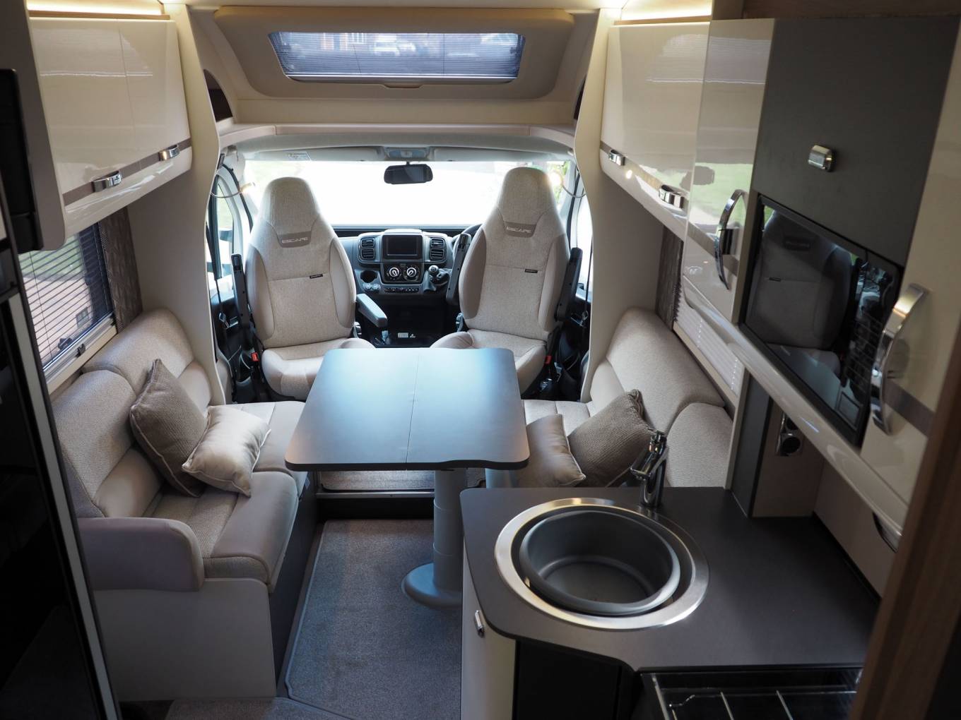 The forward dinette has an electrically lowered table with extension, this helps to create the base for the forward dinette bed. Each of the two side settees has a pop up travelling seat, making 4 travelling seats in total.