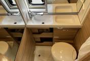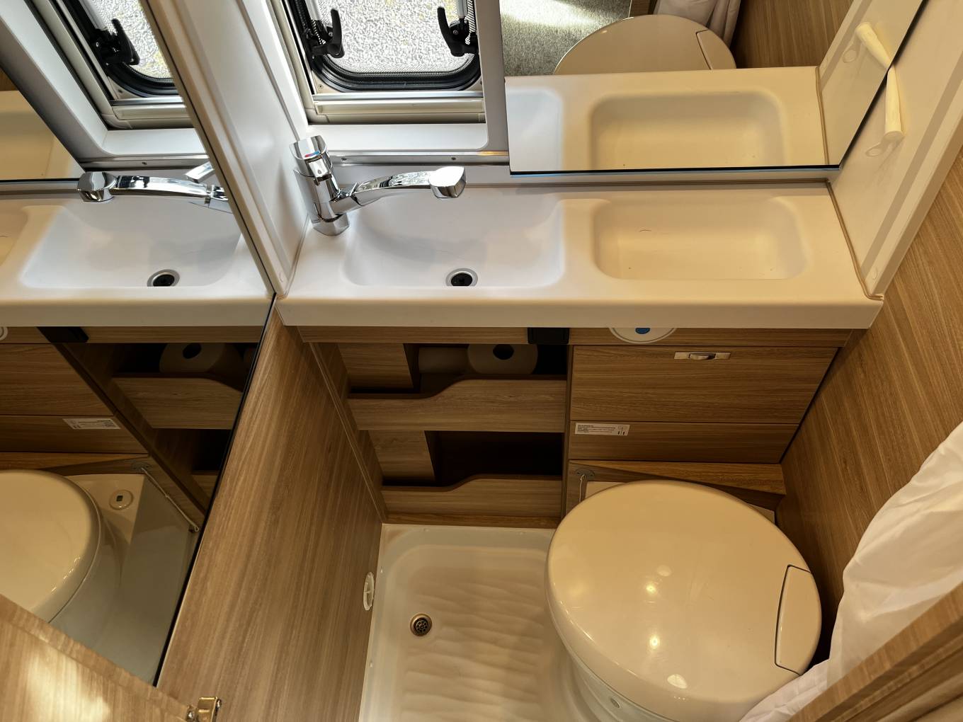 Washroom – Electric flush cassette toilet - Sink – Shower, large mirror and storage cupboard.