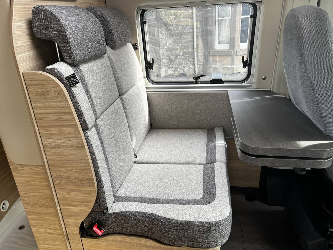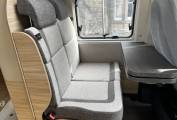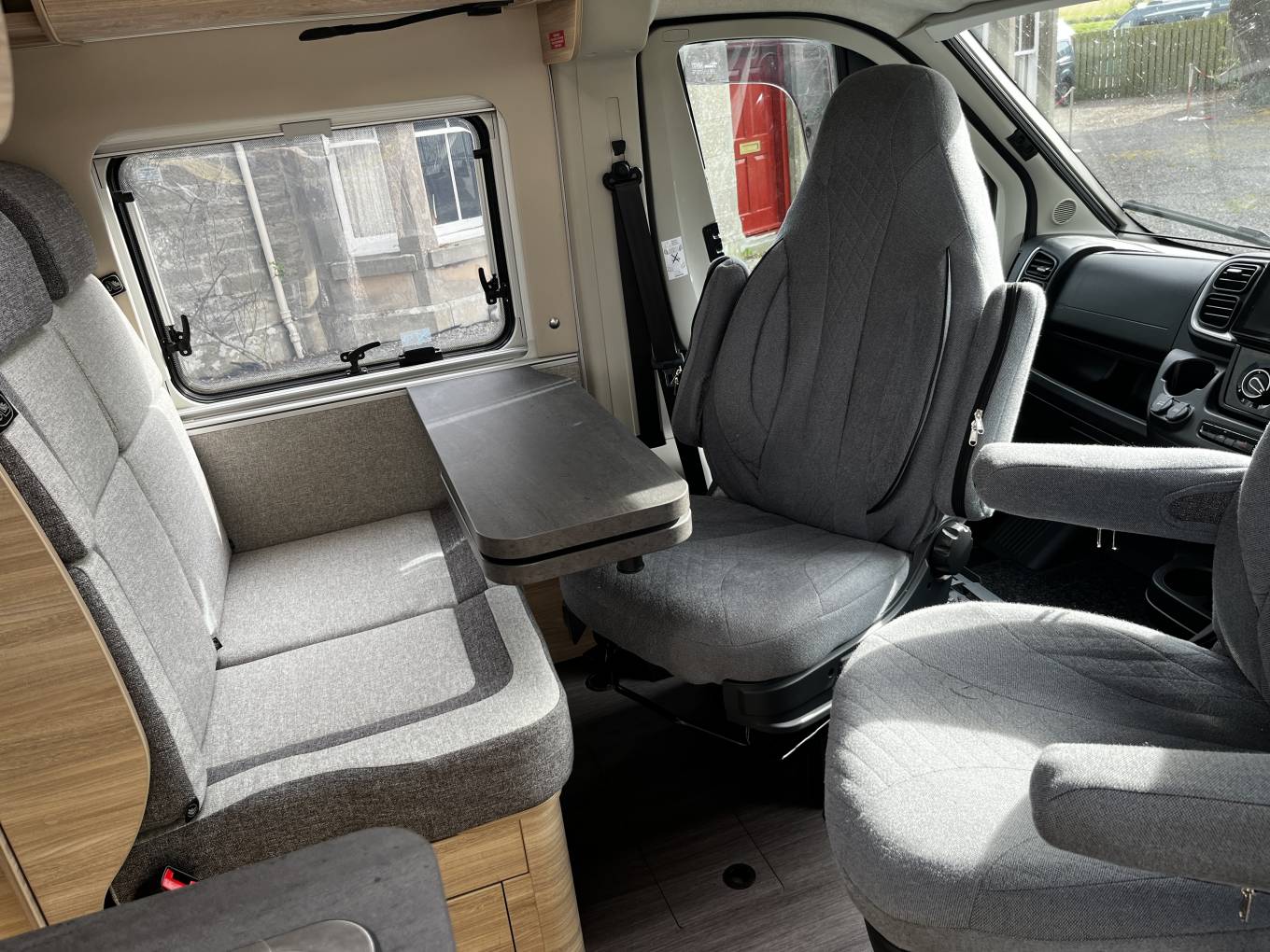 Lounge/Dining– Bench seat with 2 travel belts, 2 x cab swivel seats, moveable table with small extension.