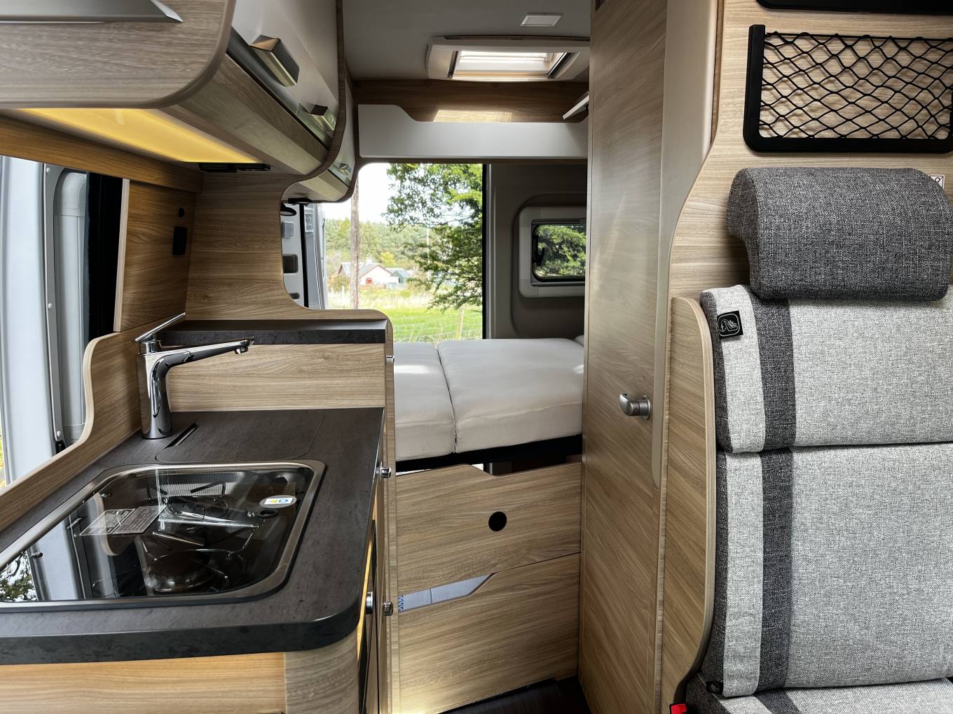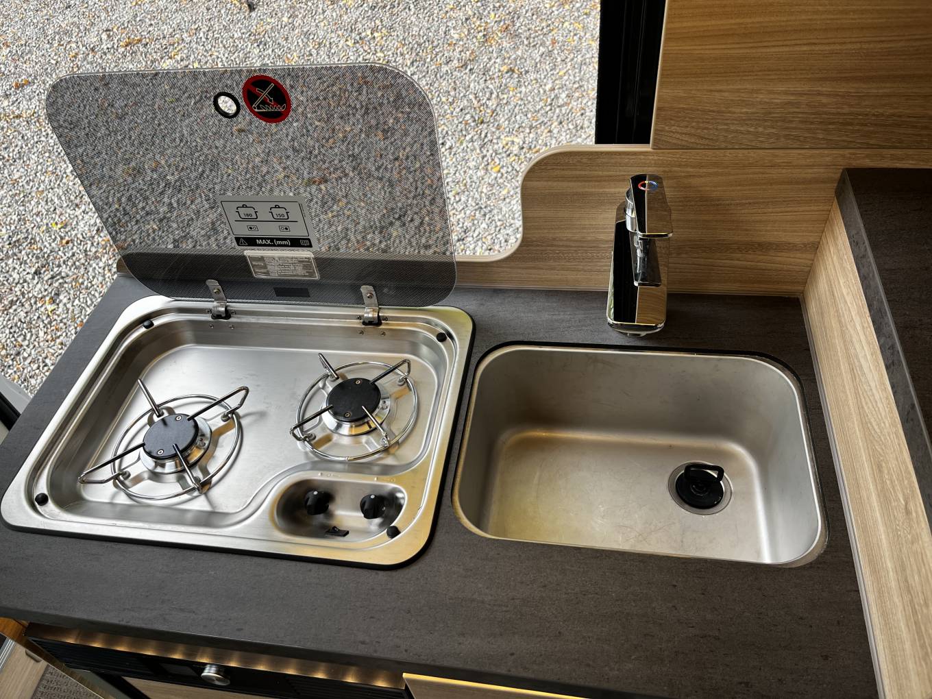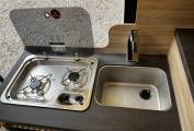 Kitchen – 2x Burner gas hob, Sink with Hot and cold running water, 3-way fridge freezer. Good storage for all your kitchen needs, including 240v power plugs and lighting.