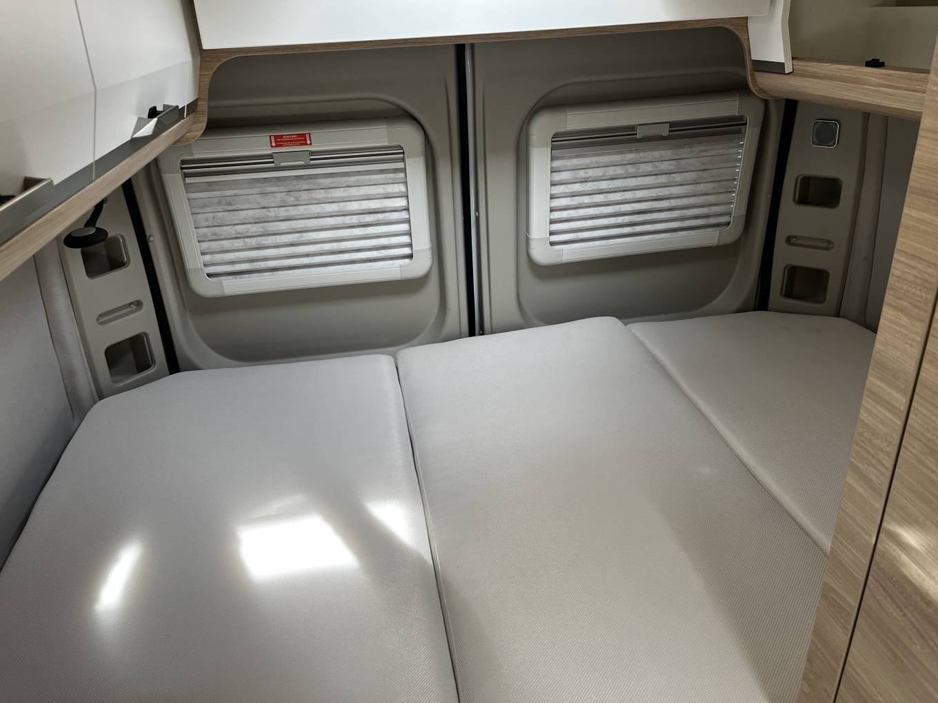 Sleeping – Rear Transverse double bed which can be dismantled should you wish to use the rear of the vehicle for a large garage space. Fly screen and blinds on rear windows, plenty of over head storage and reading lights. Front Dinette can be transformed into a single bed.