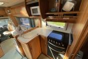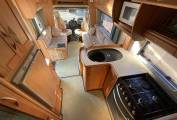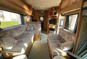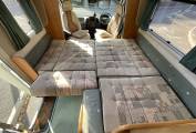 Using the electric step, you enter the motorhome at the lounge/dining area this features an L-Shaped sofa and long bench seat adjacent to this. There is plenty of storage in the vehicle with over head lockers and cupboards.