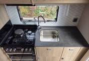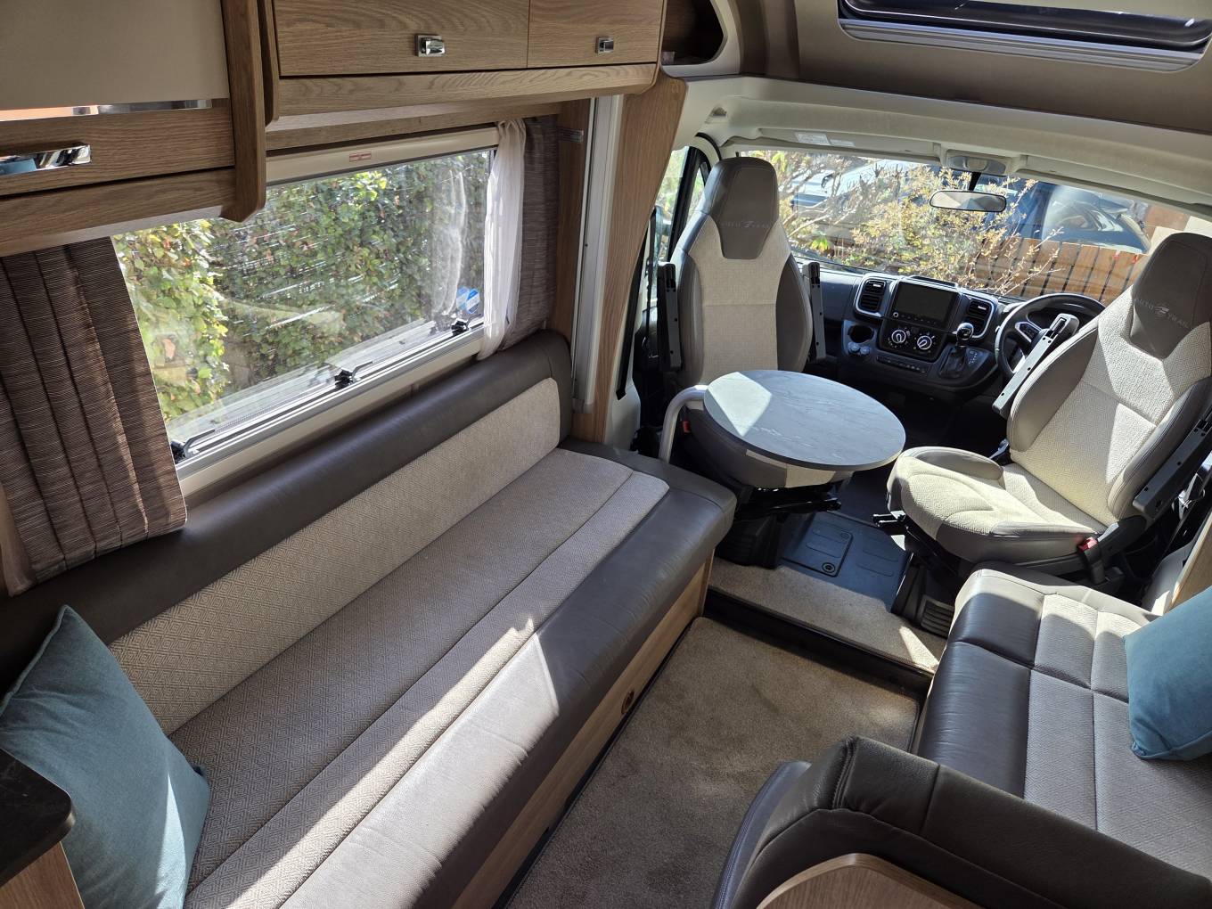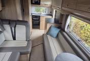 General: Premium, bright interior design with modern finishes and high-quality upholstery. Standard dual-fuel heating and hot water system, cab blinds and loose-fit carpets. Truma air conditioning for optimal climate control. LED lighting, USB ports, 13A sockets and generous storage solutions throughout.