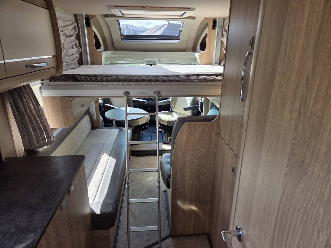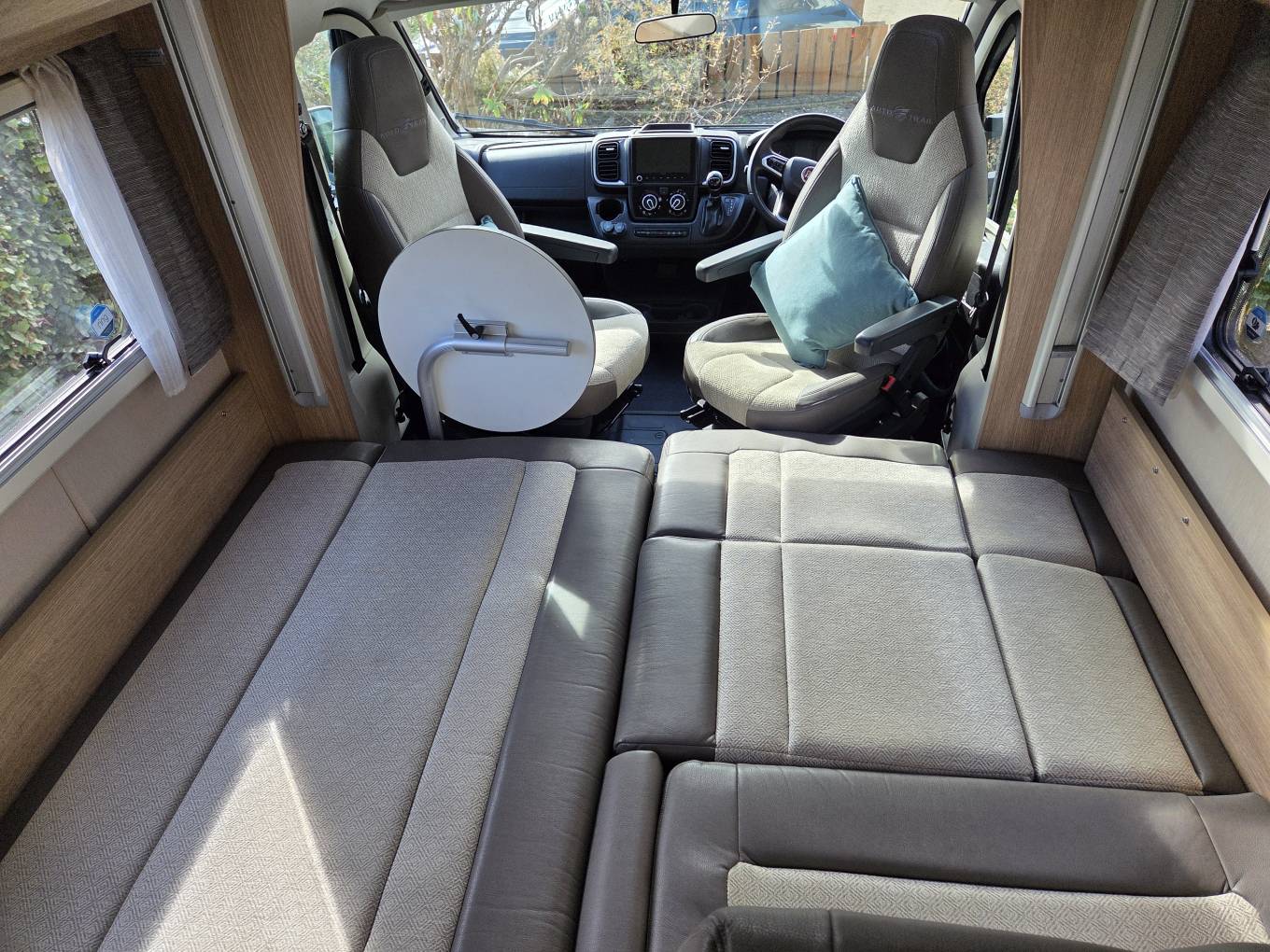 Lounge: Electronically operated drop down large double bed with access ladder. Two large bench seats that convert into a double bed. The driver’s side is ‘L-shaped’ with two forward facing seats with seat belts fitted. Separate free standing table for leisure or dining. Useful additional ‘swivel’ round table.