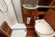 This A-Class motorhome comfortably sleeps four people with a rear fixed double bed and a convenient drop-down overcab bed, both designed for maximum comfort. At the rear, the spacious washroom includes a separate shower, toilet, and washbasin, providing the convenience of home wherever you travel.
