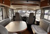 The central kitchen is thoughtfully designed and fitted with a full oven, grill, fridge, and plenty of storage, making it easy to prepare meals on the road. The dining and lounge area benefits from a swivel seat that opens up the living space, with large windows creating a bright and inviting interior.