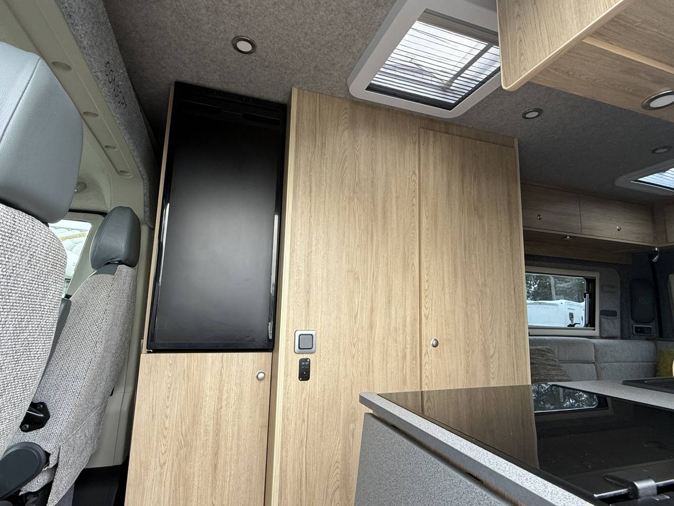 Large fridge freezer to the rear of the drivers seat , across there is the galley kitchen with the hob and sink below are loads of drawers and storage option with extendable pop up work surfaces to extend the work area with a clever pop up 3 pin socket tower that can be recessed when not on use.