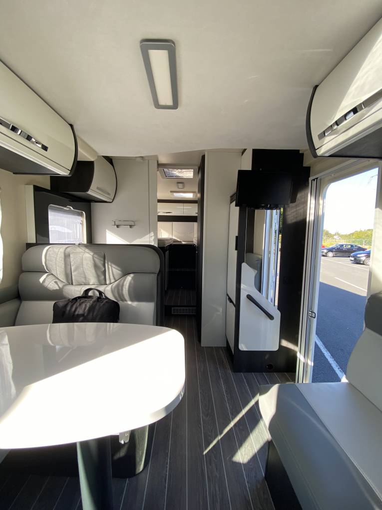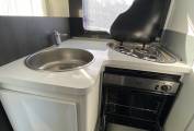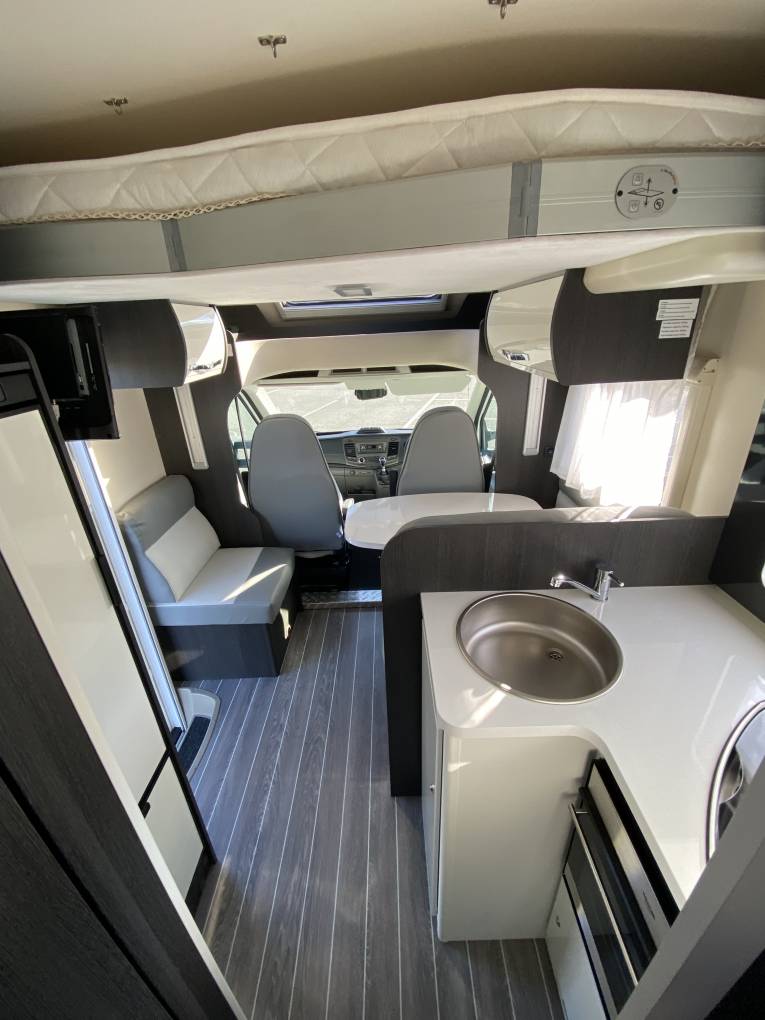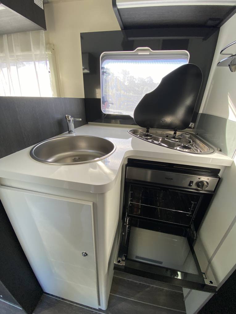 The layout is as you enter the vehicle you are greeted with smooth Italian styling and above is the drop down bed which is electric powered and boasts enough space for two adults. The kitchen comes fully equipped with 3 Gas burners, a full sized 3-way Fridge and Freezer, a sink and then plenty of worktop space and storage.