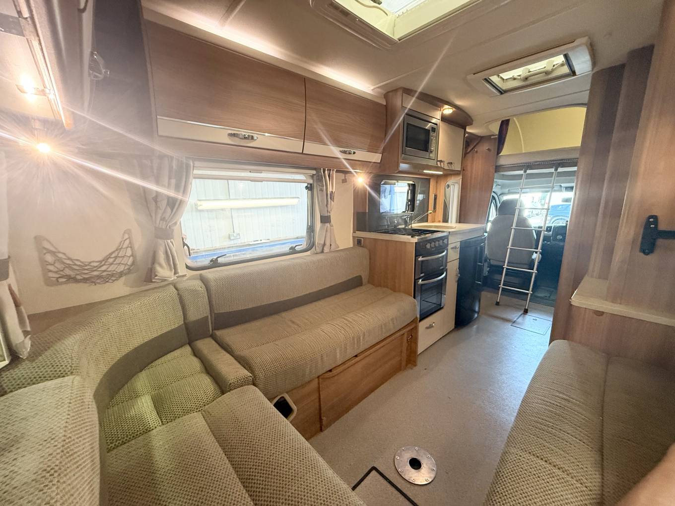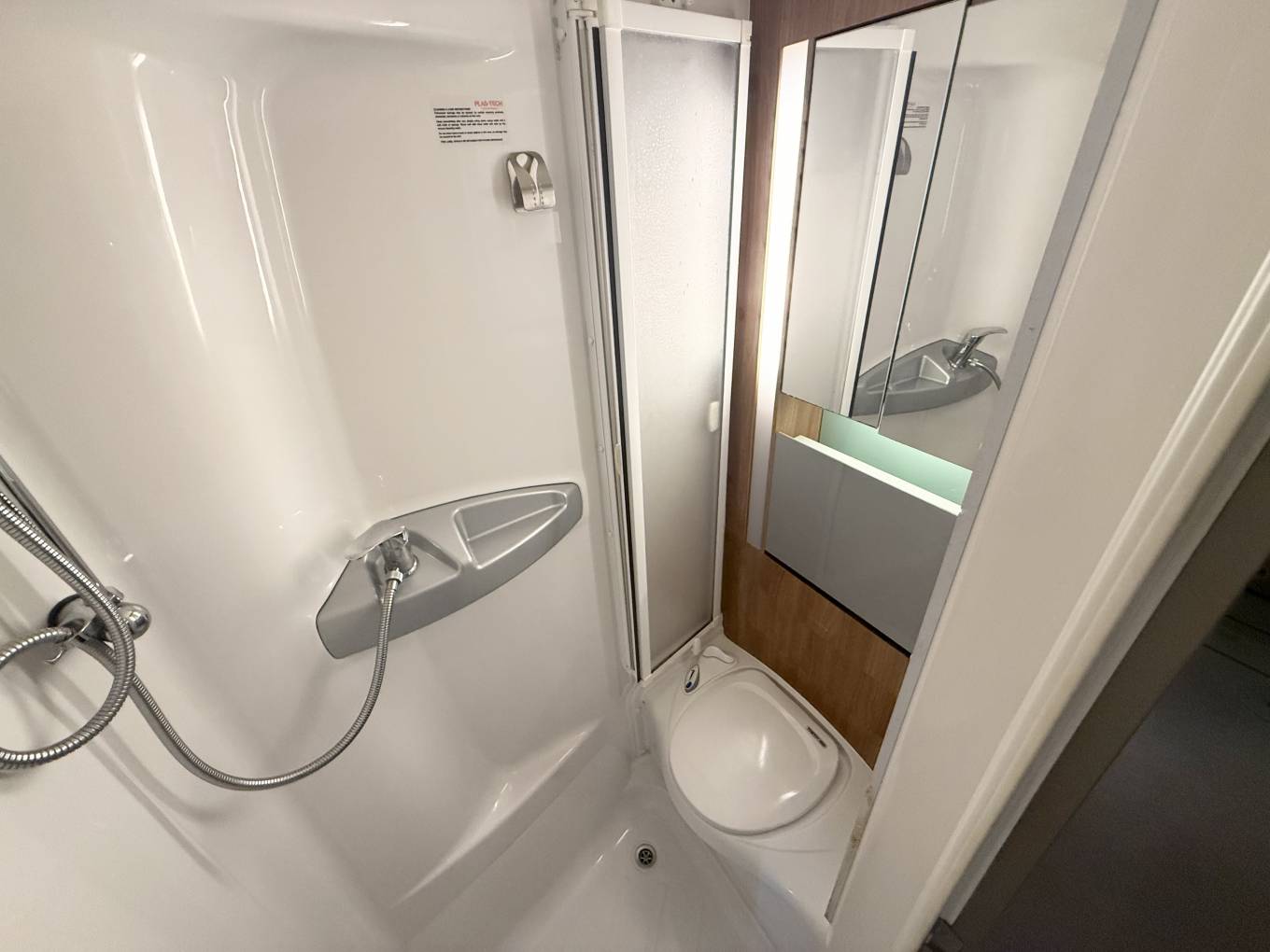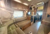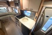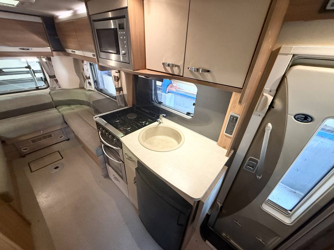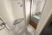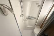 the more you look at this layout, the more you realize just how well it would suit a variety of family requirements. The spacious U-shaped lounge gives you ample relaxing space – and an excellent family dining area, too. You can seat any number up to five – and more if some of the party is of small stature and small years. Night-time accommodation comes in the form of an over-cab double bed – but the real bedtime luxury is at the back, where you have three sleeping options. You can make up two singles or pull out the bases of the settees to make a gigantic double. These bases come out from the side of the motorhome, enabling you to make two wider single beds if you wish – that’s your third option. The microwave sits in a cabinet that gives you a good-sized cupboard and two central shelves. The gas hob has three burners plus a mains hotplate, plus oven and grill. There’s a small amount of work surface to the right of the sink. Showering arrangements in a mid-sized motorhome are never the most luxurious you’ll find in space terms – but the room hits the spot with its in creating a usable shower in a small space.