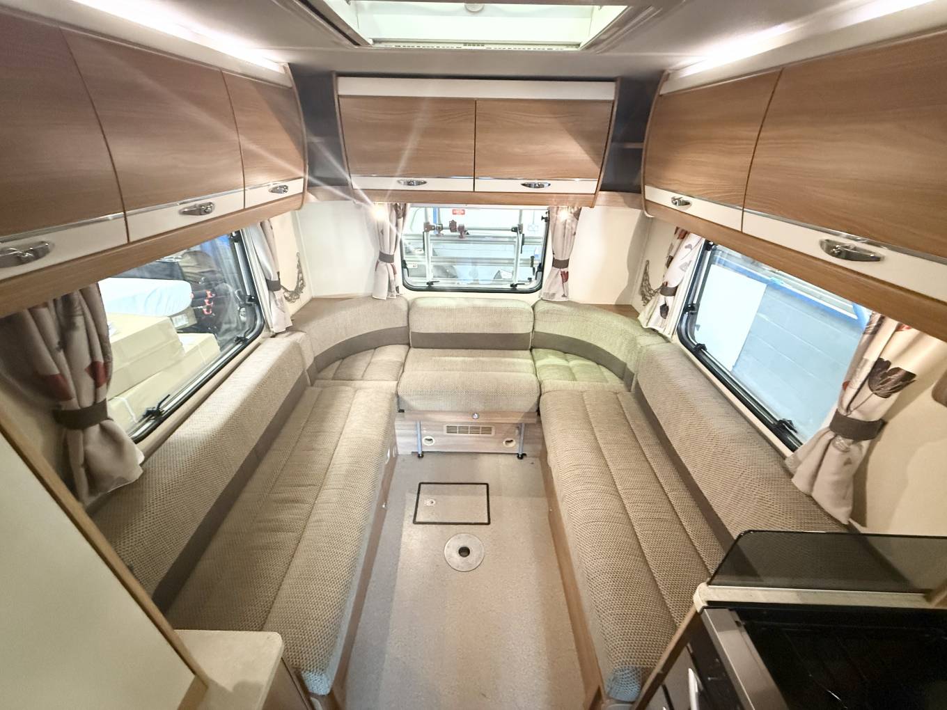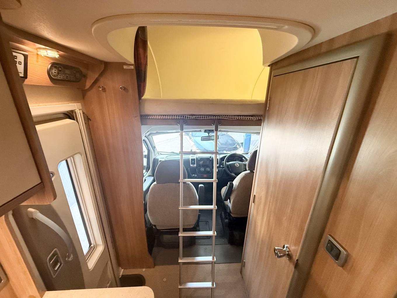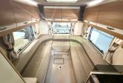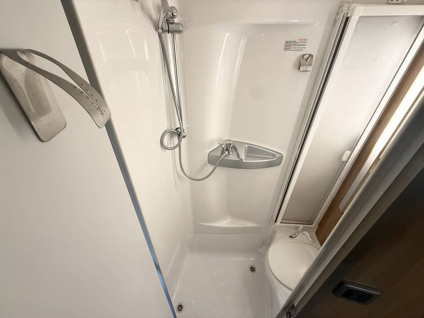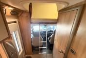 the more you look at this layout, the more you realize just how well it would suit a variety of family requirements. The spacious U-shaped lounge gives you ample relaxing space – and an excellent family dining area, too. You can seat any number up to five – and more if some of the party is of small stature and small years. Night-time accommodation comes in the form of an over-cab double bed – but the real bedtime luxury is at the back, where you have three sleeping options. You can make up two singles or pull out the bases of the settees to make a gigantic double. These bases come out from the side of the motorhome, enabling you to make two wider single beds if you wish – that’s your third option. The microwave sits in a cabinet that gives you a good-sized cupboard and two central shelves. The gas hob has three burners plus a mains hotplate, plus oven and grill. There’s a small amount of work surface to the right of the sink. Showering arrangements in a mid-sized motorhome are never the most luxurious you’ll find in space terms – but the room hits the spot with its in creating a usable shower in a small space.