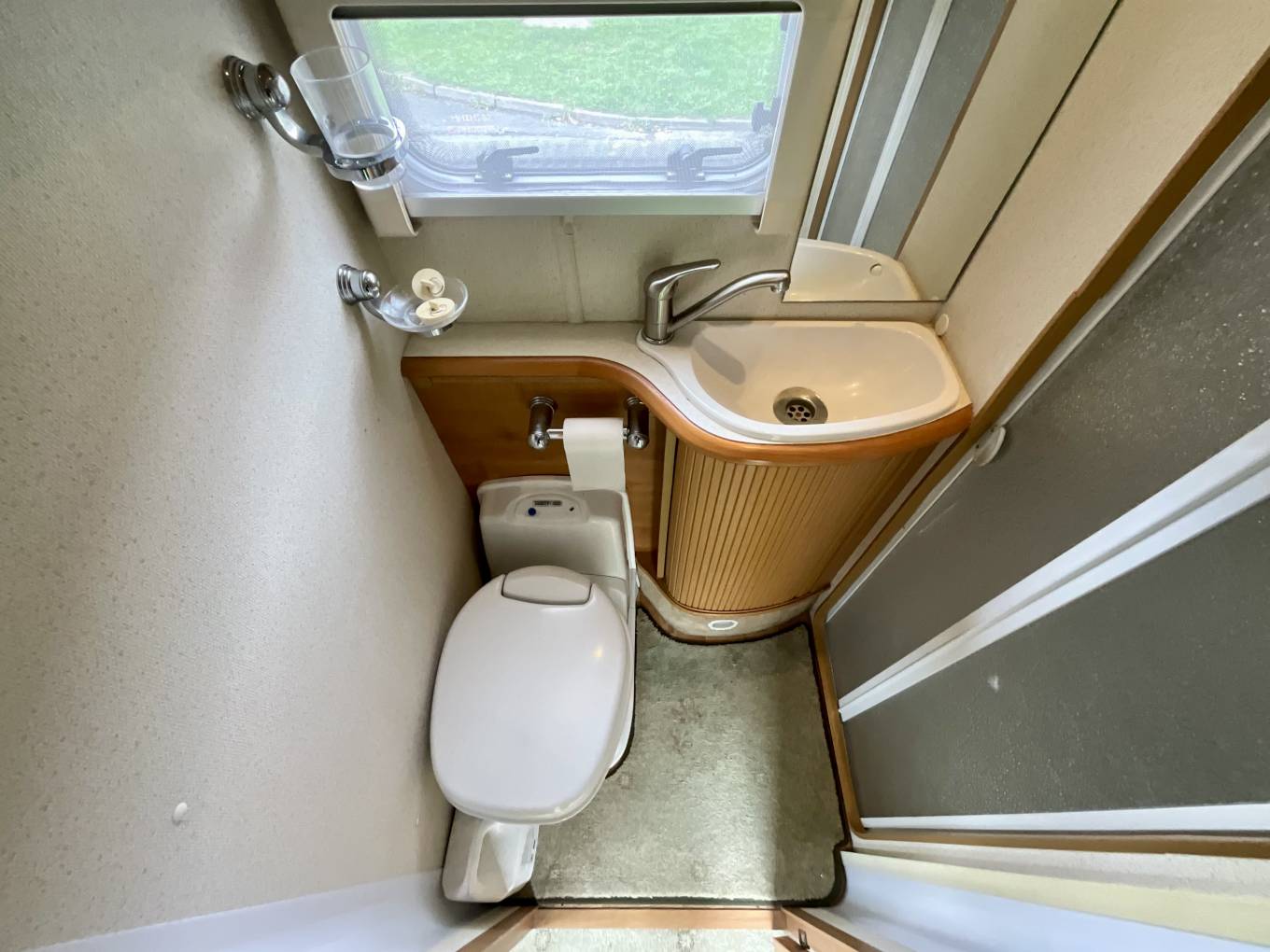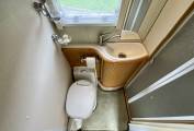 The washroom is spacious and has it's own shower cubicle, Thetford toilet with cassette, washbasin, vanity unit and cupboard.