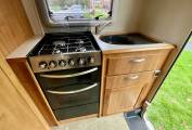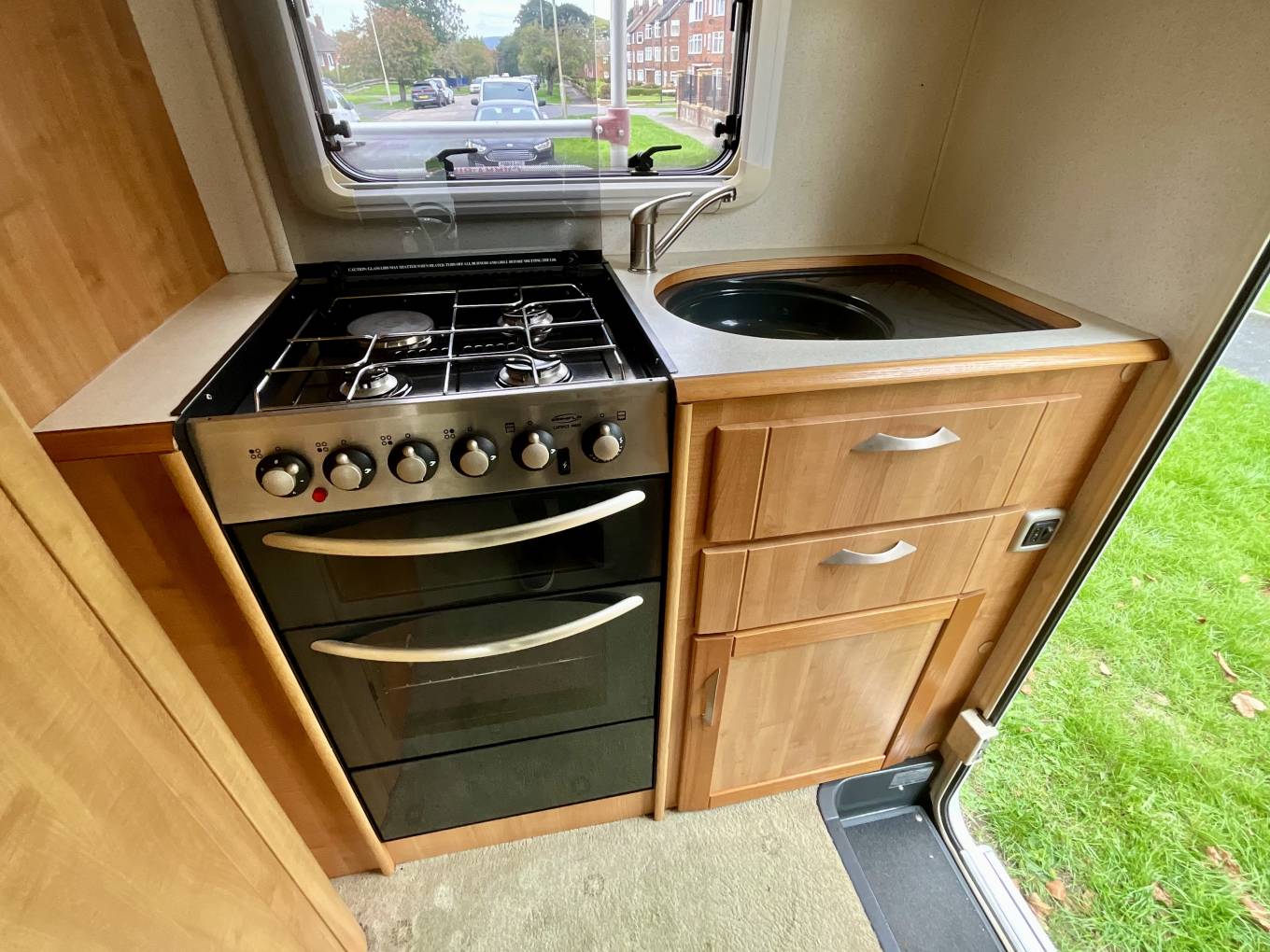 To the rear, a well equipped kitchen features gas hobs, electric hot plate, oven/grill, three way fridge/freezer, sink and microwave, plus plenty of storage throughout.