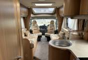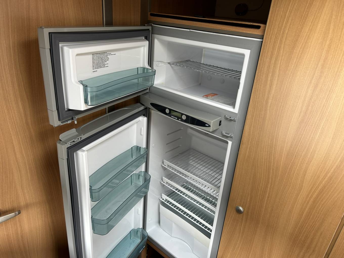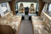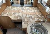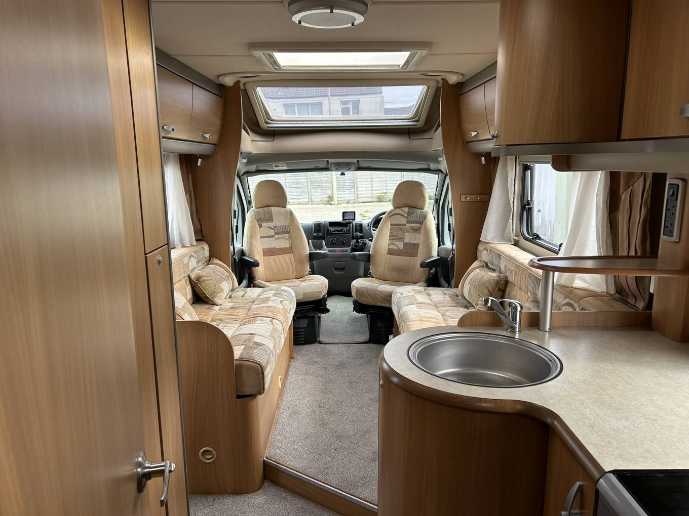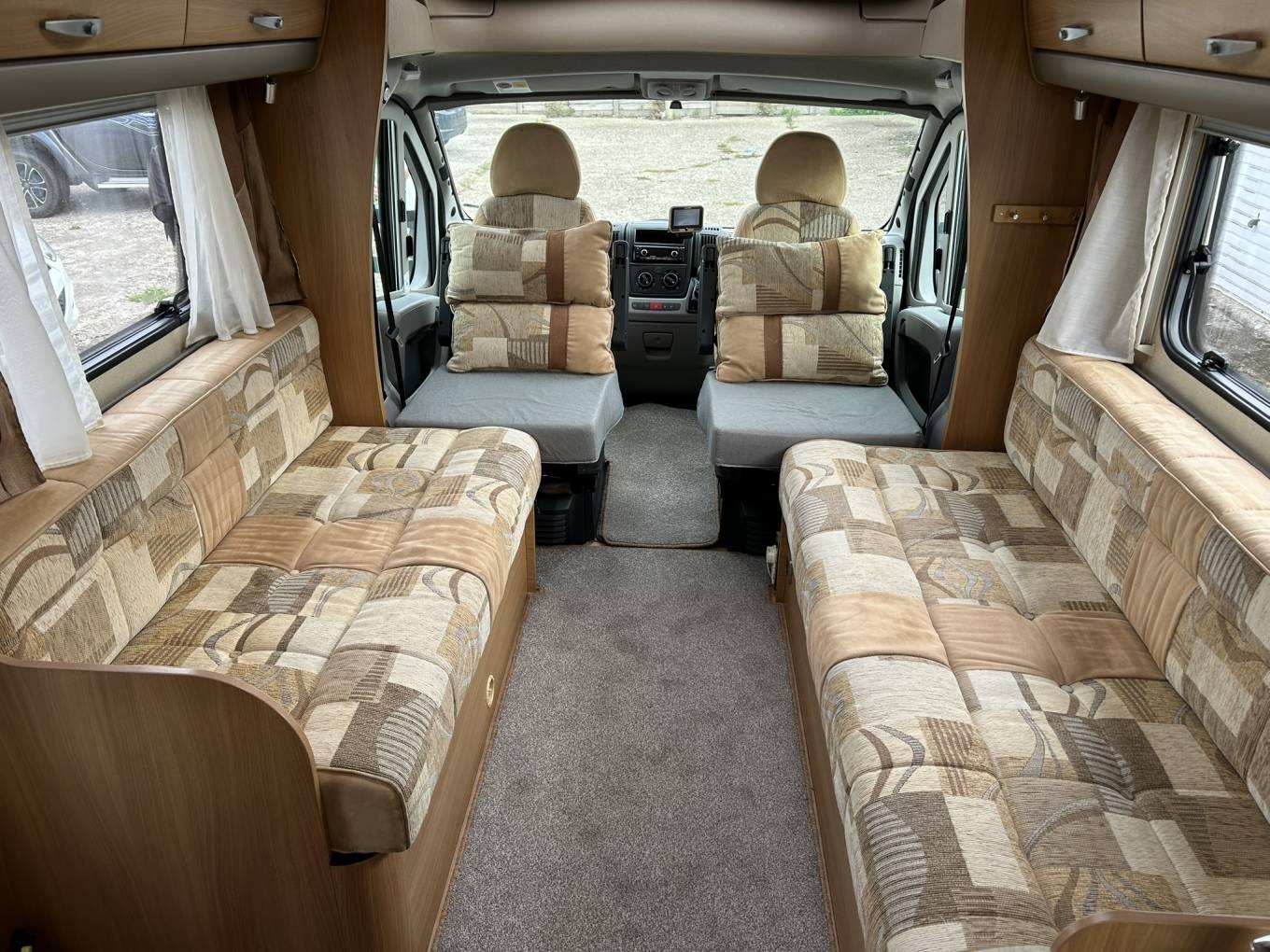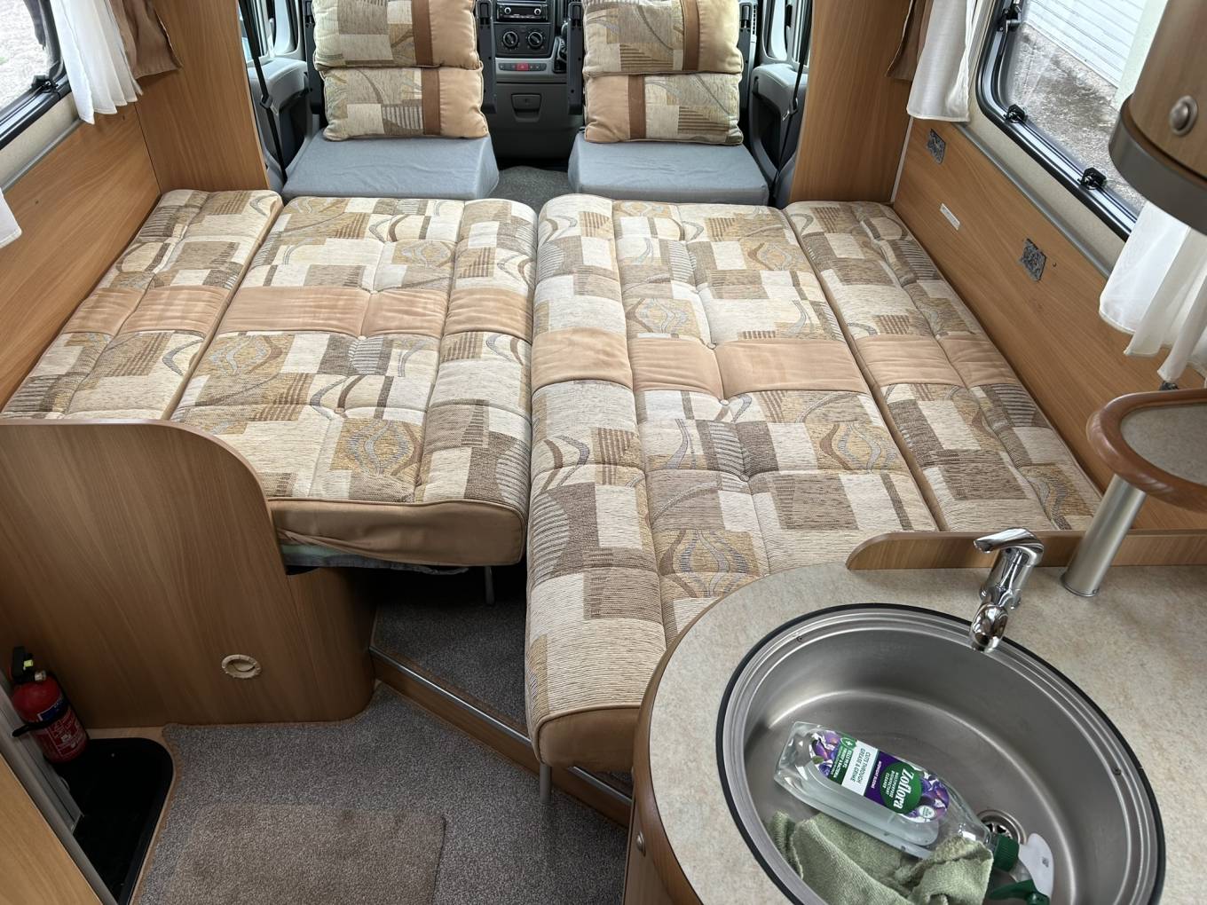 As you enter the van you will find a well equipped kitchen comprising of a large fridge with freezer compartment, oven with grill, sink with mixer tap, duel fuel 4 ring hob and plenty of storage for all your kitchen essentials.