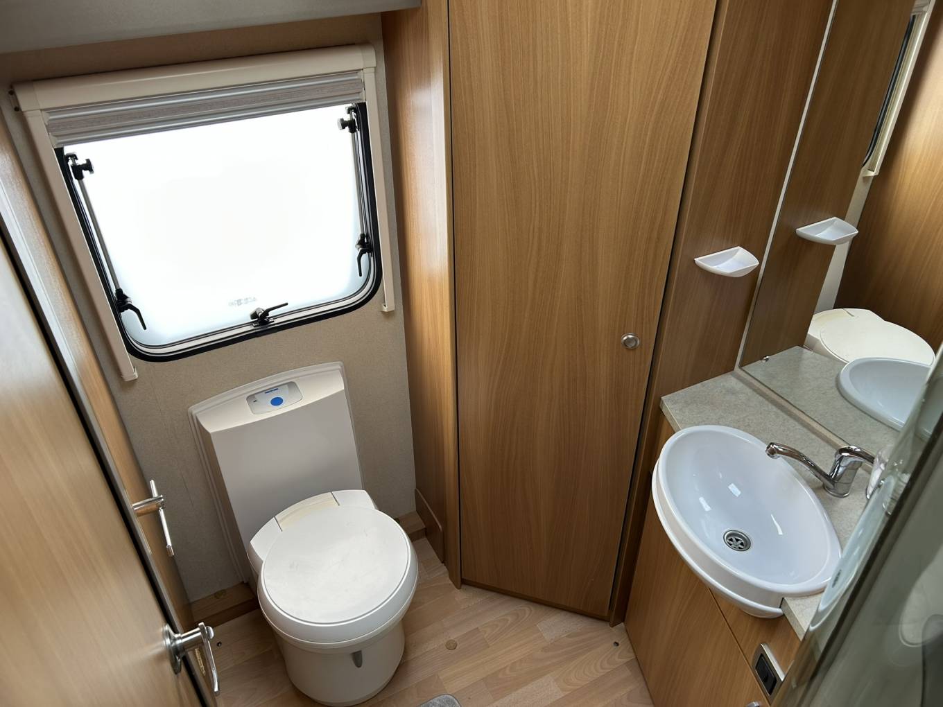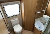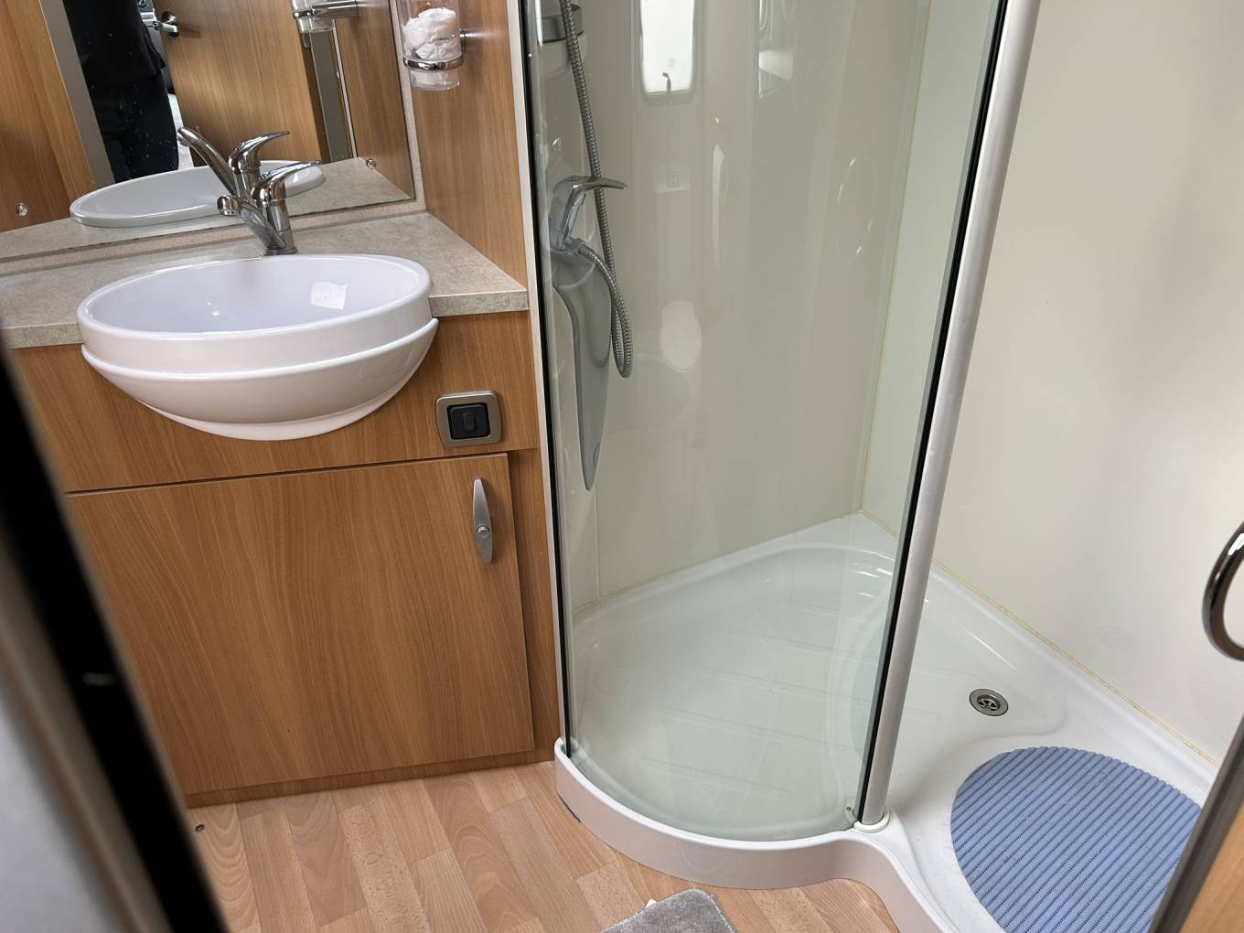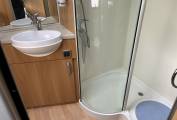 What really makes this van special is the very spacious washroom featuring a large shower cubicle, tall corner storage unit, cassette toilet, hand basin with vanity unit and a large mirror.