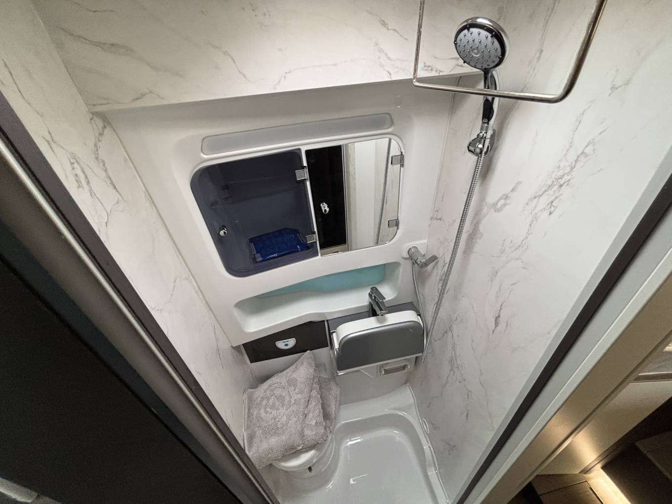 • Washroom: Modern washroom with shower, basin, and toilet.