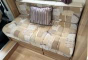 The rear fixed, French bed has additional storage surrounding, including a large wardrobe, plus privacy screen.