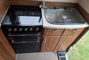 The kitchen is to the rear of the vehicle, with a hob with three gas burners and an electric plate, a sink, an oven, a grill. There is a microwave, and a fridge with a freezer box, beside the habitation door.